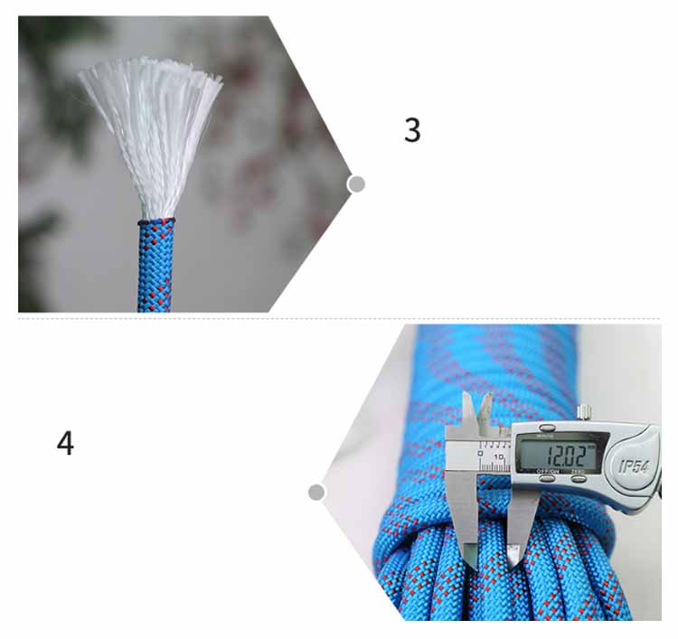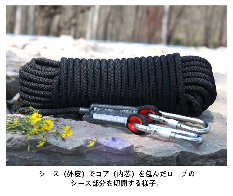 | アウトドア 多目的ロープ 20m 高密度ご編んごおり滑りにくく耐摩耗性に優れています。 シース(外皮)でコア(内芯)を包んだロープのシース部分を切開する様子。 | |