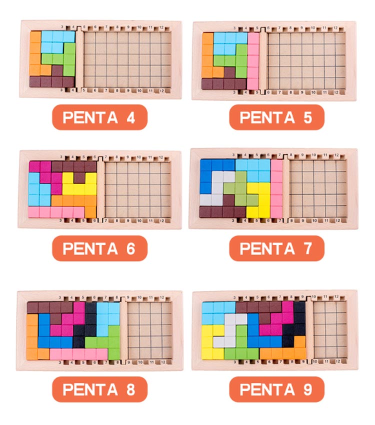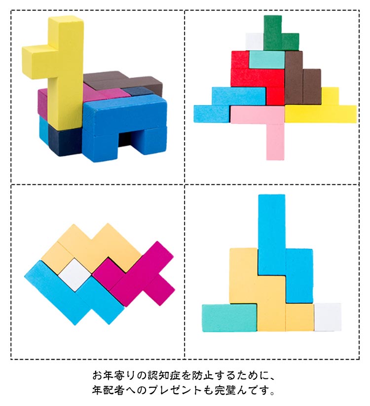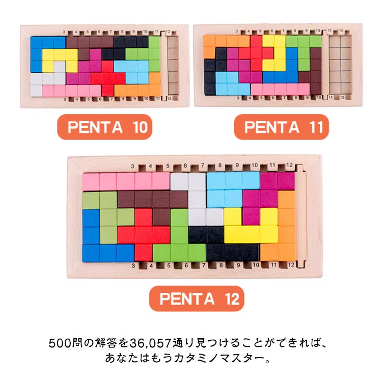 【木製パズル】【知育玩具】【脳トレ】36,057の組合わせが数学的脳をつくる「カタミノ」。様々な形をしたブロックを組み合わせ、指定されたマス目を埋めていく思考型ゲーム。500問の解答を36,057通り見つけることができれば、あなたはもうカタミノマスター。発想力に加え気力・精神力を鍛えて、やわらか頭を手に入れろ!マス目の範囲や選ぶブロックの数によって難易度設定ができ、年齢やスキルに関係なく誰でも自分のレベルに応じて遊ぶことができる。お誕生日プレゼントにオススメです。遊びながら色、図形感覚を育て、創造性を高めます。お子様が楽しみながら学習することが出来ます!お年寄りの認知症を防止するために、年配者へのプレゼントも完璧んです。