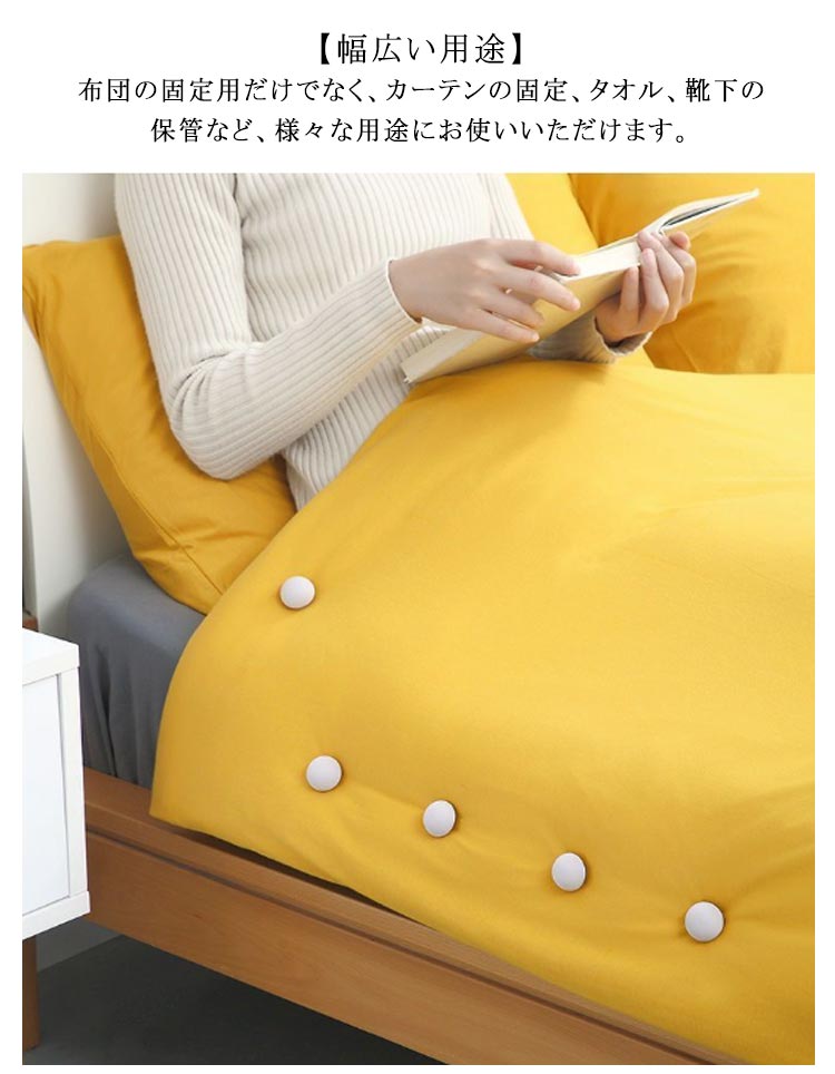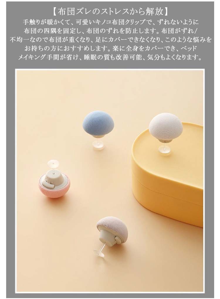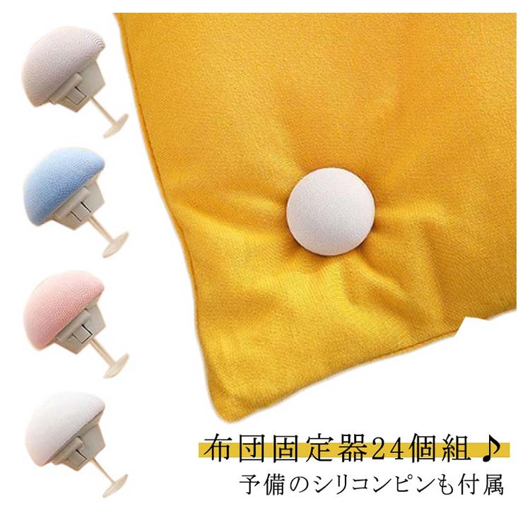 布団固定器24個組♪予備のシリコンピンも付属【布団ズレのストレスから解放】手触りが暖かくて、可愛いキノコ布団クリップで、ずれないように布団の四隅を固定し、布団のずれを防止します。布団がずれ/不均一なので布団が重くなり、足にカバーできなくなり、このような悩みをお持ちの方におすすめします。楽に全身をカバーでき、ベッドメイキング手間が省け、睡眠の質も改善可能、気分もよくなります。【暖かい肌触り・可愛い設計】布団クリップの外は温かいコットン綿素材を採用しており、普通のプラスチック製クリップと違って、肌触りが寒くない、もっと暖かいです。春秋冬季節に適しています。シンプル「きのこ」のデザインで可愛くおしゃれです。ピンク、ホワイト、ブルー、グレー、四つの色があります。自分のシーツによって選択でき、好きなように組み合わせることもできます。【高品質素材・安定ボタン設計】ボタン設計でもっと安定で、布団をしっかりと固め、クリップが外れる心配はありません。伝統的な鋭い金属針を変え、固定用の釘は高品質シリコンPET素材を使用しており、軽量で堅固、耐久性も優されて、ちくちくしなくで、傷を防ぐことができます。もっと安全で、子供にも適用されます。【嬉しい予備シリコン針付属】24個組にシリコン針は45本付属で、もっと長くお使いいただけるのが嬉しいポイント。【幅広い用途】布団の固定用だけでなく、カーテンの固定、タオル、靴下の保管など、様々な用途にお使いいただけます。