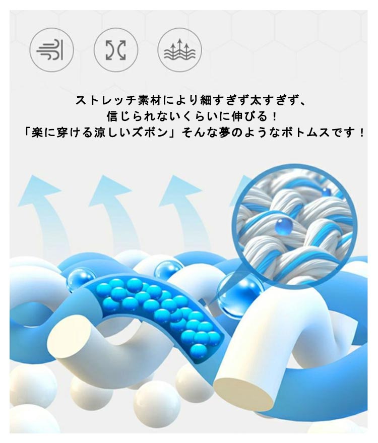 暑苦しい夏において、寝具を中心に爆発的人気の「接触冷感」を使用。穿くだけで涼しい、夏の常識を覆す!ストレッチ素材により細すぎず太すぎず、信じられないくらいに伸びる!「楽に穿ける涼しいズボン」そんな夢のようなボトムスです!驚くほど伸びる伸縮自在のストレッチ素材を採用!スポーツやヨガなど激しい動きにもストレスなくご使用いただけます。在宅ワークにもオススメ!長時間座っていても疲れにくい伸びる素材に、汗のべたつきを抑える吸水速乾性、そして部屋着見えしない豊富なバリエーション!暑い時期の中でもさらっとした心地良い手触りはべたつきの苦手な方にオススメです!