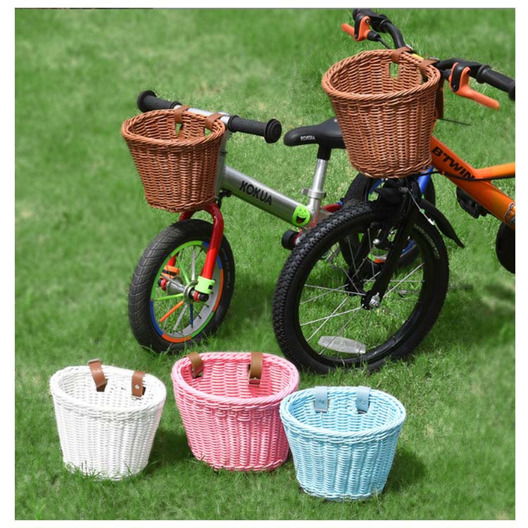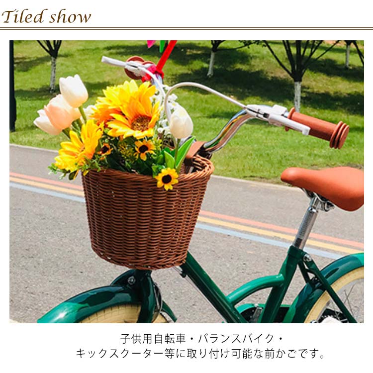 | 子供用自転車?バランスバイク?キックスクーター等に取り付け可能な前かごです。 レザーベルトを巻くだけで簡単に取り付けられます。 子供用の遊具にぴったりなミニサイズのラタンバスケットです。 | |