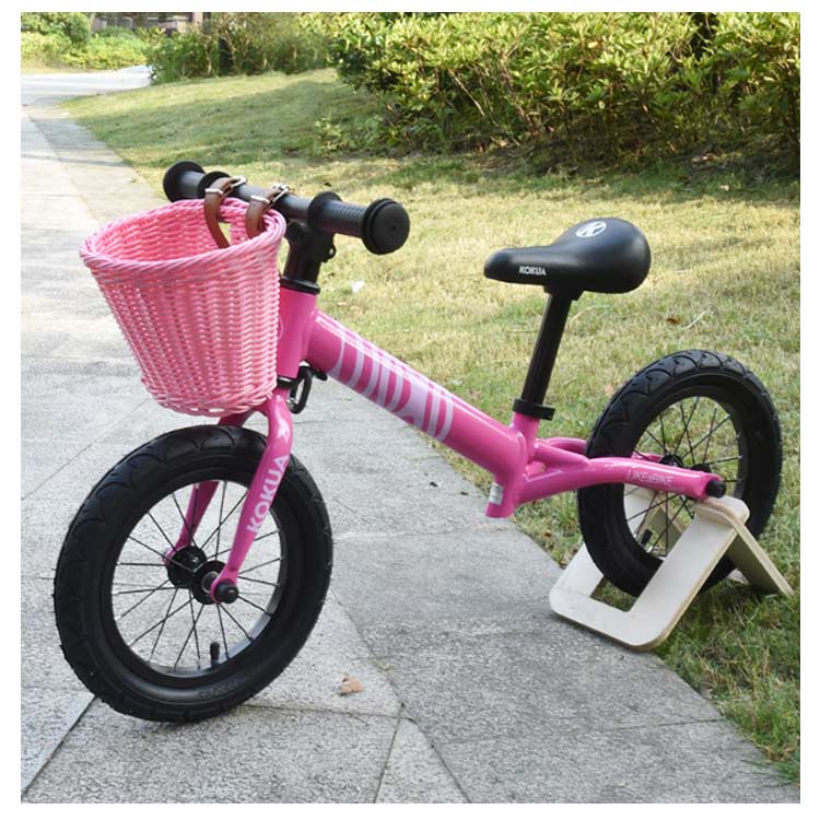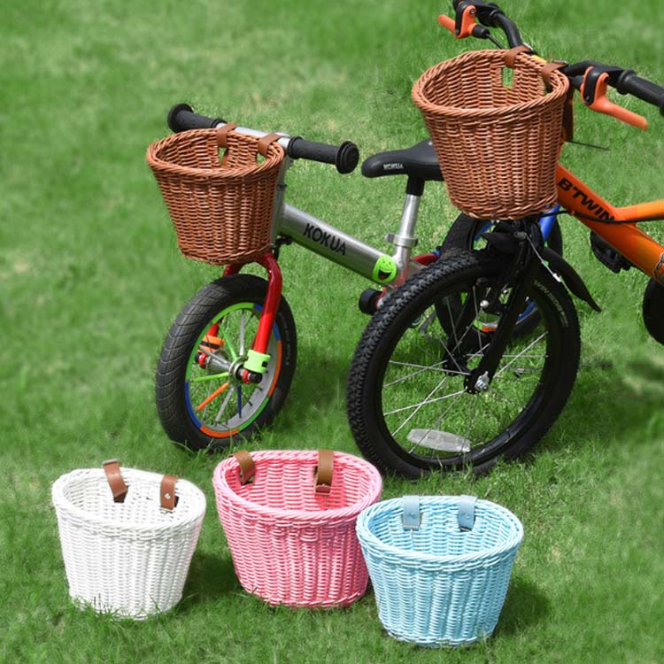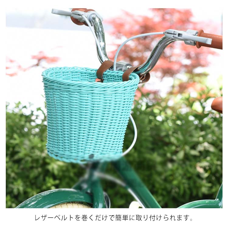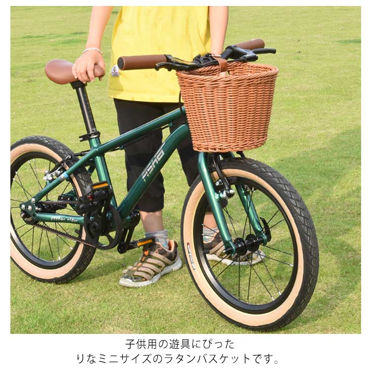子供用自転車・バランスバイク・キックスクーター等に取り付け可能な前かごです。レザーベルトを巻くだけで簡単に取り付けられます。子供用の遊具にぴったりなミニサイズのラタンバスケットです。