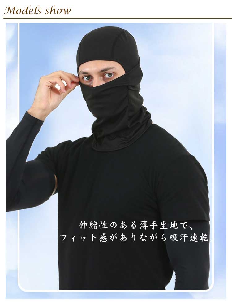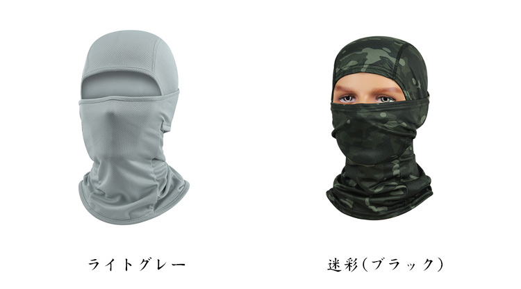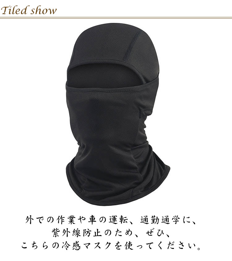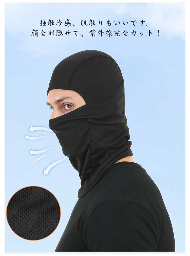 | 春夏用バラクラバ。 伸縮性のある薄手生地で、フィット感がありながら吸汗速乾。 接触冷感、肌触りもいいです。 顔全部隠せて、紫外線完全カット! これから暑くなるとマスクし続けるのも結構辛くなるため、日焼け止め、冷感に効果がいいこちらのフェイスカバーは最適! 外での作業や車の運転、通勤通学に、紫外線防止のため、ぜひ、こちらの冷感マスクを使ってください。 | |