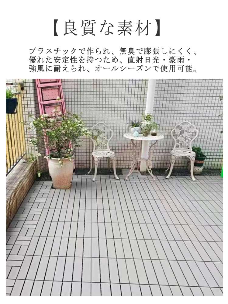 簡単なインストールで格上げ!瞬時にらくらくセッティング!【良質な素材】プラスチックで作られ、無臭で膨張しにくく、優れた安定性を持つため、直射日光・豪雨・強風に耐えられ、オールシーズンで使用可能。【簡単設置】工具要らずにパズルのように繋げるだけで女性でも気軽に設置ができる。【お手入れ簡単】特有の防水設計により、床にホコリが溜まりにくく、床を清潔に保つことができます。【気分次第の拡張利用も】ジョイントタイルは、ベランダや床、デッキなどの硬い平坦な表面に敷設することができ、スリッパなしの素足で使える。