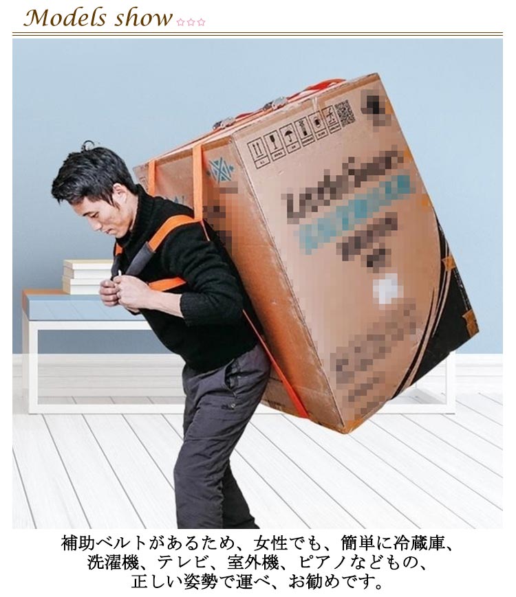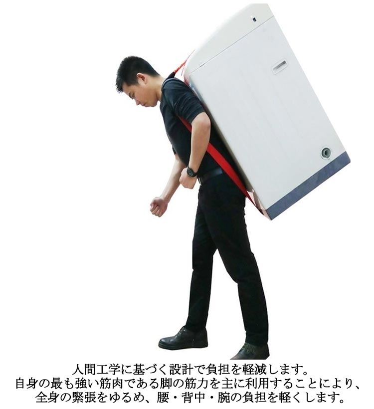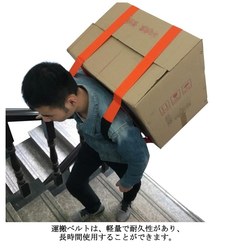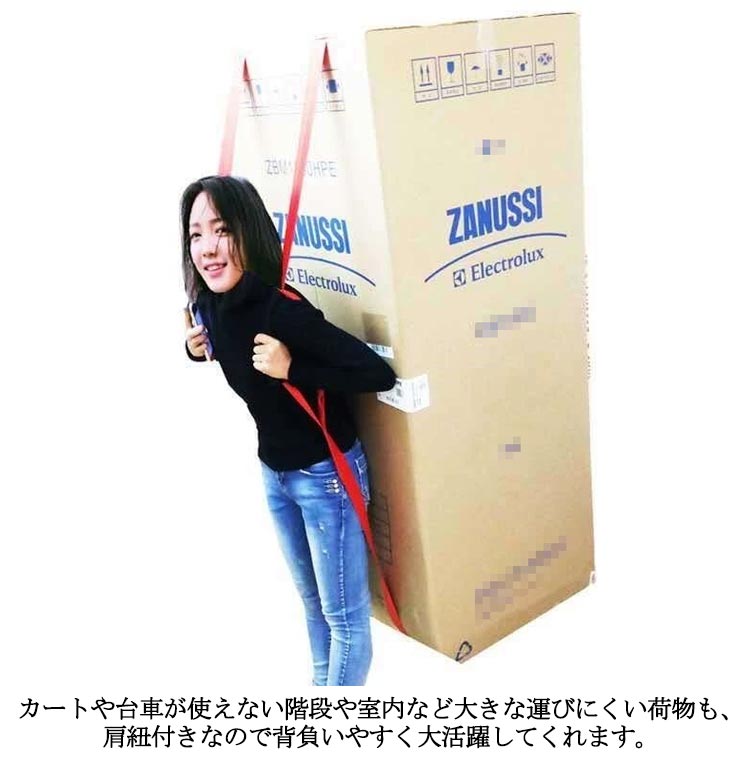 | 2本セット!大きな家具を簡単に楽々運べる運搬ベルト 補助ベルトがあるため、女性でも、簡単に冷蔵庫、洗濯機、テレビ、室外機、ピアノなどもの、正しい姿勢で運べ、お勧めです。 運搬ベルトは、軽量で耐久性があり、長時間使用することができます。 人間工学に基づく設計で負担を軽減します。自身の最も強い筋肉であ る脚の筋力を主に利用することにより、 全身の緊張をゆるめ、腰?背中?腕の負担を軽くします。 カートや台車が使えない階段や室内など大きな運びにくい荷物も、肩紐付きなので背負いやすく大活躍してくれます。 運搬ベルトは長さが簡単に調整できます。長すぎる、短すぎるという心配はありません。身長にかかわらず、誰でも運搬物を安全に楽々運ぶことができます。 | |