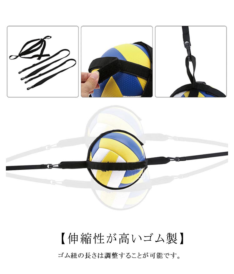 【バレーボールの練習用に】アタック、シャンピングサーブ、トス、レシーブなど場所を選ばずに一人でバレーの練習ができます。【簡単取付】ボールにマジックテープで固定するだけの簡単取付です。両端はポールなどに固定してください。【伸縮性が高いゴム製】ゴム紐の長さは調整することが可能です。