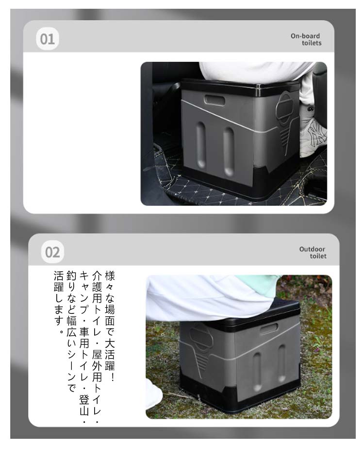 | 蓋付きポータブルトイレ+ワンタッチテント+12回分凝固剤+ゴミ袋+収納袋セット。 便座一体型折りたたみ式ポータブルトイレです。 アウトドア、部屋や車の中、災害、断水の際に大活躍します。 人間工学に基づいて設計されているので小さなお子様からお年寄りの方まで安心してお使いいただけます。 ゴミ箱としてもお使いいただけます。狭い車内にも置くことができます。 様々な場面で大活躍!介護用トイレ?屋外用トイレ?キャンプ?車用トイレ?登山?釣りなど幅広いシーンで活躍します。 水洗いできるのでいつでも清潔を保てます。 軽量設計なので持ち運び、組立て楽々! 力の弱い方、女性、小さなお子様でも簡単に組立てることができます。また折りたたみ式で平らに収納できるため、収納場所に困りません。 | |