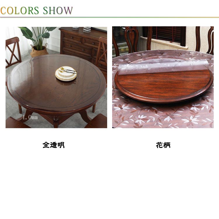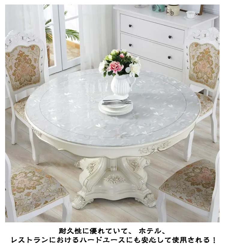 | 【テーブルマット】【直径:80cm/90cm/100cm/110cm/120cm】 大切なテーブルを傷?汚れから保護します 新品透明PVCテーブルクロス、シンプルで明るいお部屋を彩ります! 透明で、木目や塗装色などの、家具本来の美しさを損なうことなくご使用いただけます。 お子様がいる家庭は、食べこぼしや汁物こぼれも安心! 透明だからお好きな色のテーブルクロスを下に敷いて合わせてもお洒落で簡単に洗浄、普段のお手入れは簡単な拭き取りで十分です。 水と油の汚れ防止、重い圧力に抵抗し、寒さと熱、酸とアルカリ。テーブルの天板保護に最適なマットです! 耐久性に優れていて、 ホテル、レストランにおけるハードユースにも安心して使用される! | |
