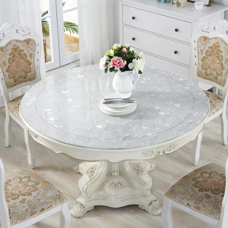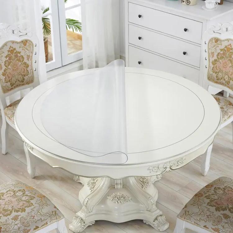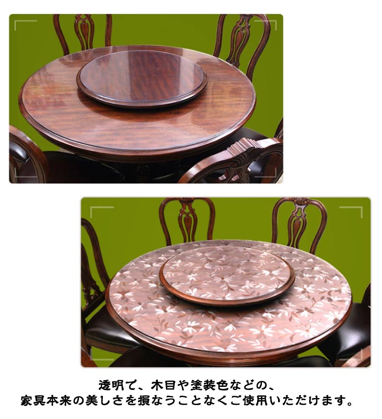 【テーブルマット】【直径:80cm/90cm/100cm/110cm/120cm】大切なテーブルを傷・汚れから保護します新品透明PVCテーブルクロス、シンプルで明るいお部屋を彩ります!透明で、木目や塗装色などの、家具本来の美しさを損なうことなくご使用いただけます。お子様がいる家庭は、食べこぼしや汁物こぼれも安心!透明だからお好きな色のテーブルクロスを下に敷いて合わせてもお洒落で簡単に洗浄、普段のお手入れは簡単な拭き取りで十分です。水と油の汚れ防止、重い圧力に抵抗し、寒さと熱、酸とアルカリ。テーブルの天板保護に最適なマットです!耐久性に優れていて、 ホテル、レストランにおけるハードユースにも安心して使用される!