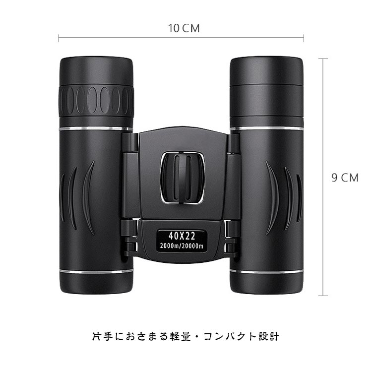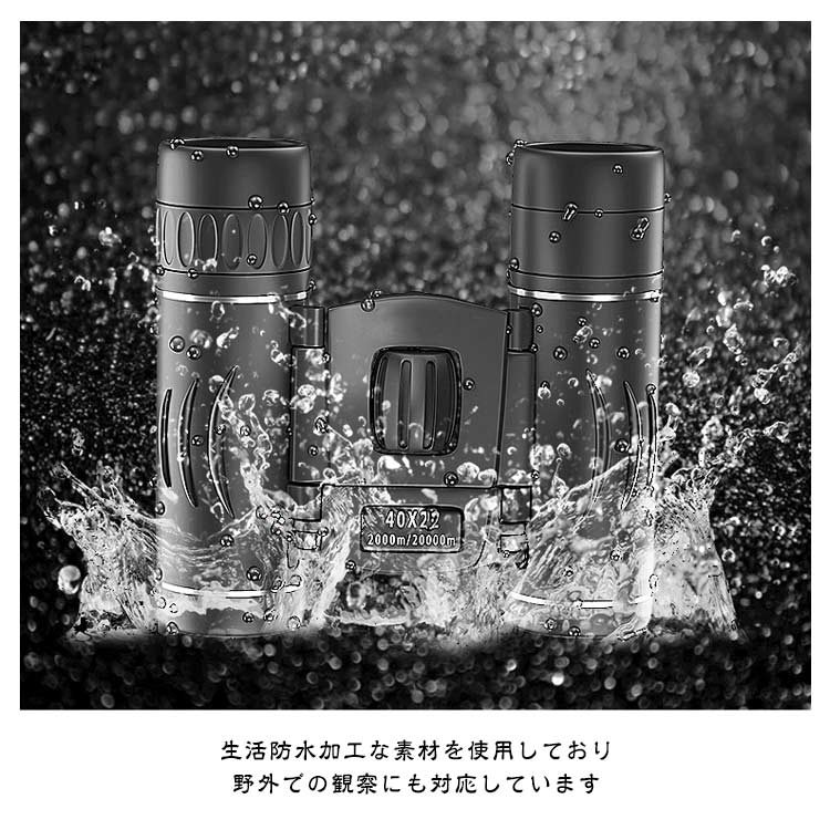 ・高倍率40倍!約2km先も確認できる!・コンサートやライブ、観劇や舞台を楽しむ40倍双眼鏡です。・持ち運びに便利な軽量コンパクトサイズながら40倍を実現。・明るくクリアな視界!Bak4光学レンズとFMC多層グリーン膜コーティングを採用。・暗い劇場内や夕暮れ時にも使える!・スマホを設置して写真撮影もOK!・生活防水加工な素材を使用しており、野外での観察にも対応しています。・長時間持っていても疲れない約170g。・片手におさまる軽量・コンパクト設計。・荷物が多い遠征時にも最適なサイズ。【使用方法】1:目の幅を調節自分の目の幅に合う様に、左右の筒の結合部をゆっくり動かして調節します2:左側レンズの調節左側の接眼部に被写体が鮮明に映るまでリングを回して下さい3:右側レンズの調節右側接眼部の調整リングを左と同じように被写体が鮮明に映るまで回して下さい4:フォーカスの調節左右の目で被写体がはっきり見える様に、フォーカスリングを調節します。