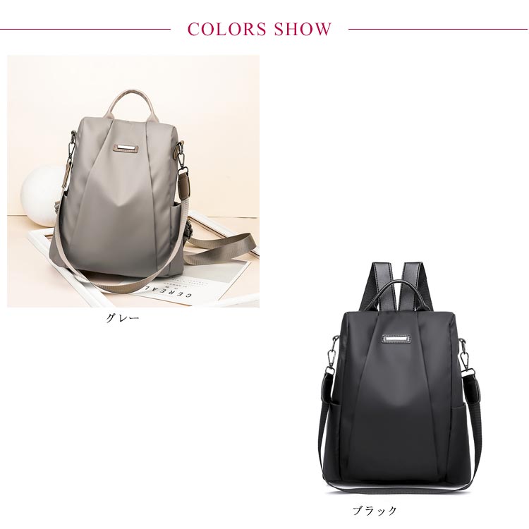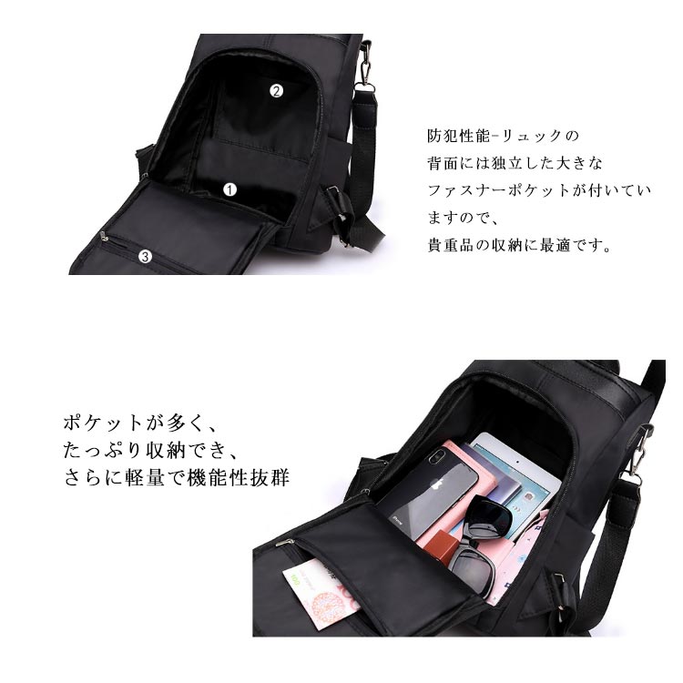 女性らしいサイズ感と実用性を兼ね揃えた防犯リュック♪防犯性能-リュックの背面には独立した大きなファスナーポケットが付いていますので、貴重品の収納に最適です。3WAY仕様リュック-肩掛け、手提げ、リュックとしても使用出来る3wayのリュックサックです。上質な高品質ナイロン素材を採用、雨の日も安心してご使用いただけます。ポケットが多く、たっぷり収納でき、さらに軽量で機能性抜群