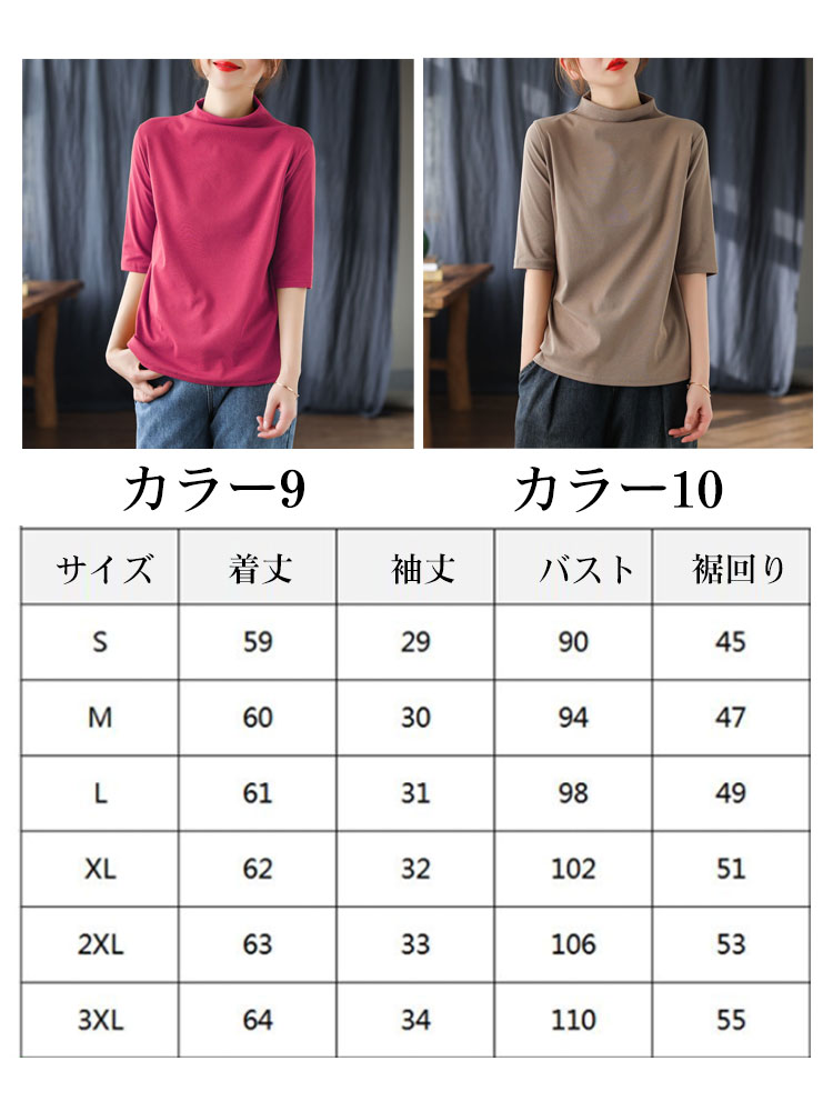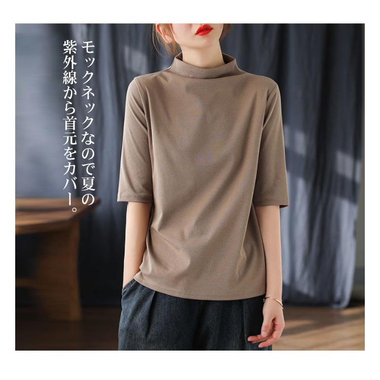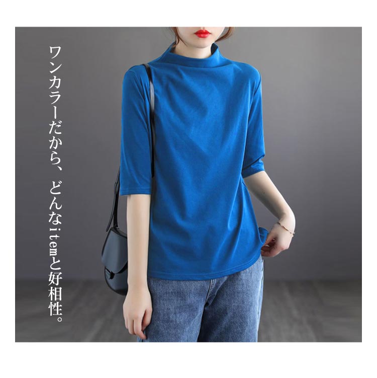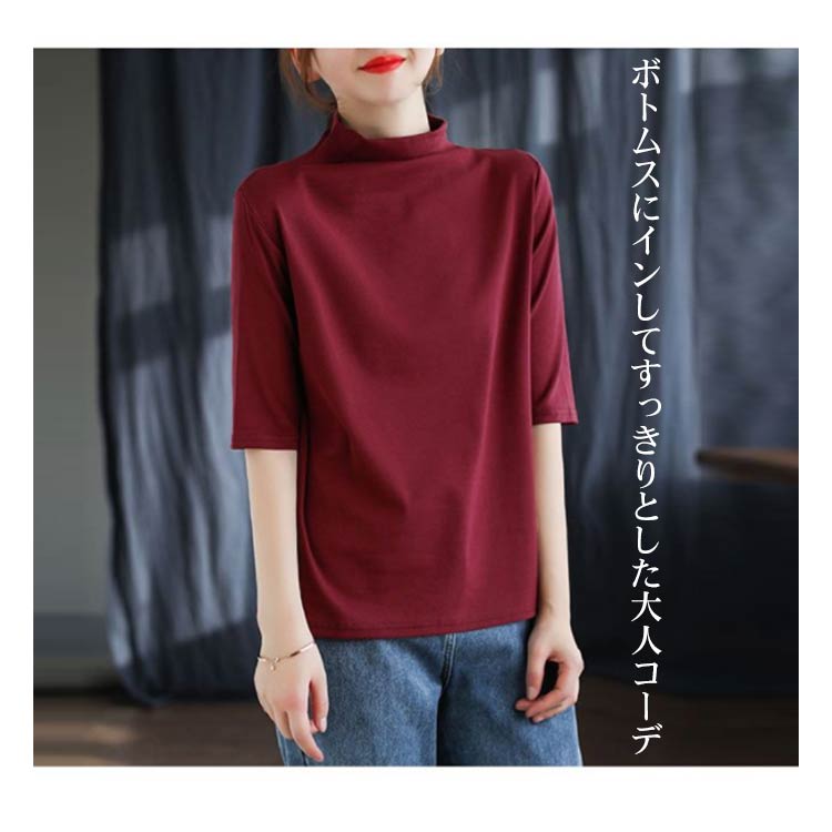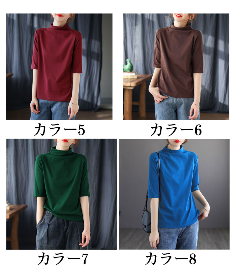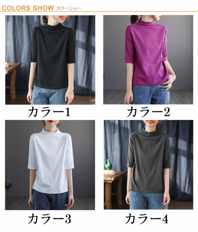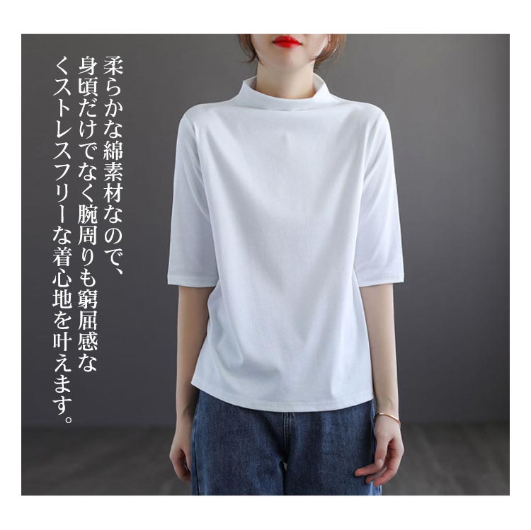 ハイネック Tシャツ レディース コットンtシャツ 五分袖 モックネック トップス ハイネックtシャツ 無地Tシャツ かわいい カジュアル 通勤 通学 白 黒 20代 30代 40代 50代 無地 シンプル おしゃれ 春夏 S M L XL 2XL 3XL 4XL