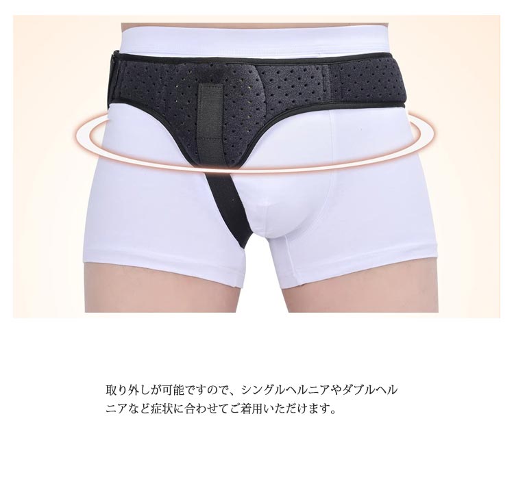 本製品はヘルニアによる痛みをサポートしてくれるアイテムです。手術後や日常生活で着用していただくことで患部を優しく保護します。一人一人の症状に合わせてベルトやパッドで微調整できるので、幅広く多くの方に満足していただけます♪取り外しが可能ですので、シングルヘルニアやダブルヘルニアなど症状に合わせてご着用いただけます。高品質なネオプレン製で肌触りも良く、耐久性に優れております。多孔質のデザインは通気性があり、長時間の着用も快適です♪内側には滑り止めの効果があるシリコンストリップがあり、動いたときにずれるのを防いでくれます。また、水洗いも可能ですので、繰り返し衛生的にご使用いただけます!男女兼用のユニセックスデザインで、ご自身に合うサイズでご着用いただけます。ご着用の際は、鼠径ヘルニアとの直接の摩擦を避けるため下着の上からをおすすめします。