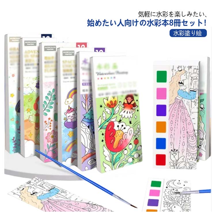 気軽に水彩を楽しみたい、始めたい人向けの水彩本8冊セット!絵の上に絵の具があるので、水だけあれば、すぐに塗り絵が描けます!画材を用意したり、後片づけをする必要がありません。予備の絵の具もあるので安心です。フルーツ、食べ物、植物、生き物、雑貨など、身近でかわいいモチーフが、どれも簡単に完成します。 モチーフごとに使う色をチップで表示してあるので、迷うことはありません。かんたんな線画を鉛筆で描いたら色塗りスタート。透明水彩をもっと気軽に楽しみましょう。