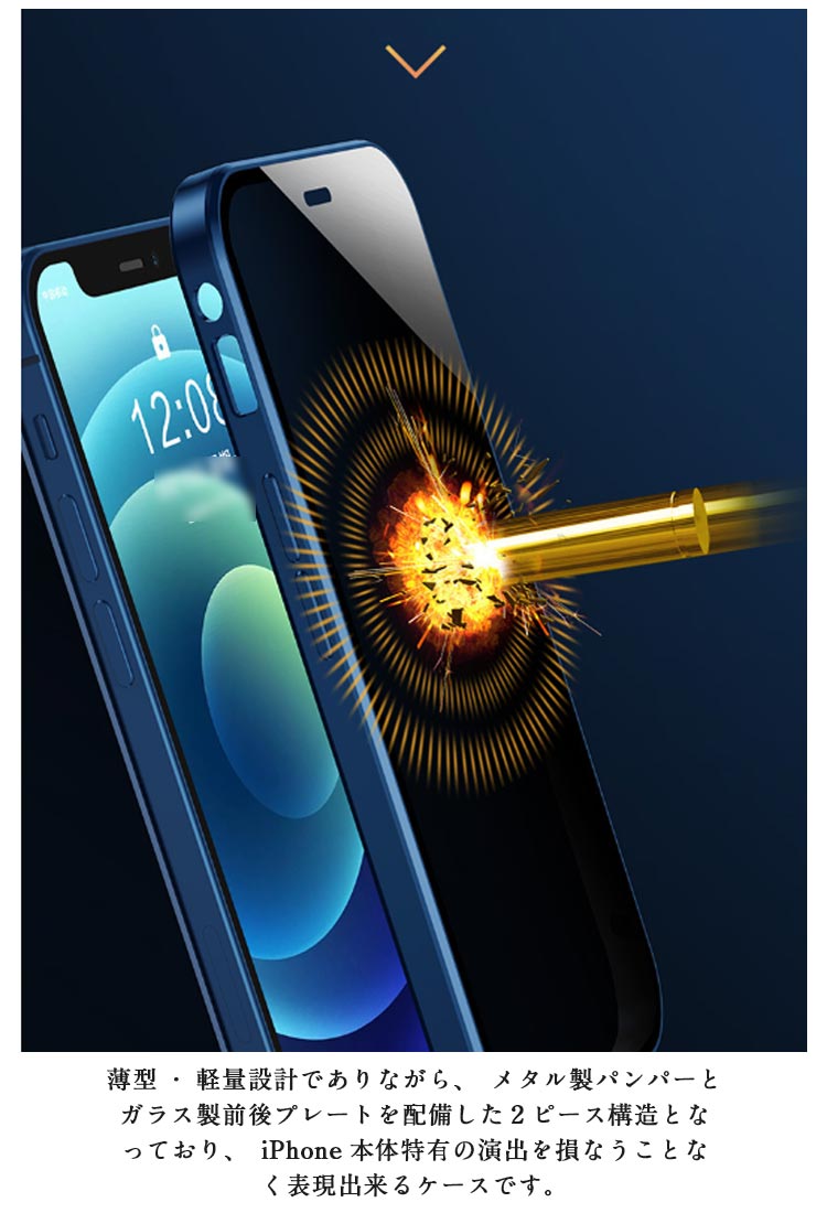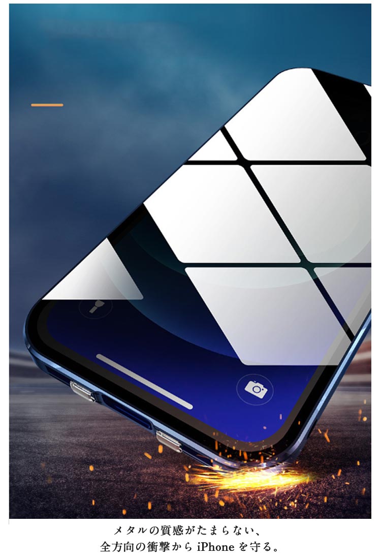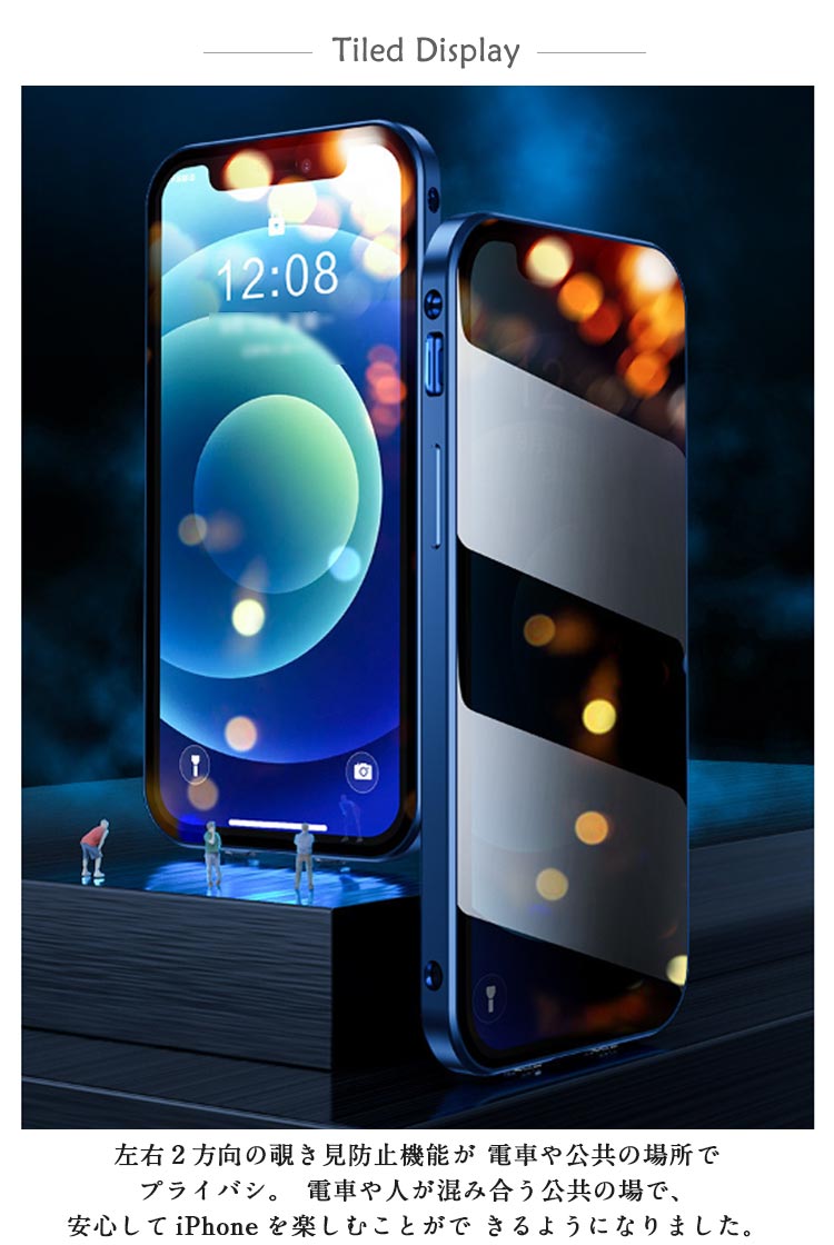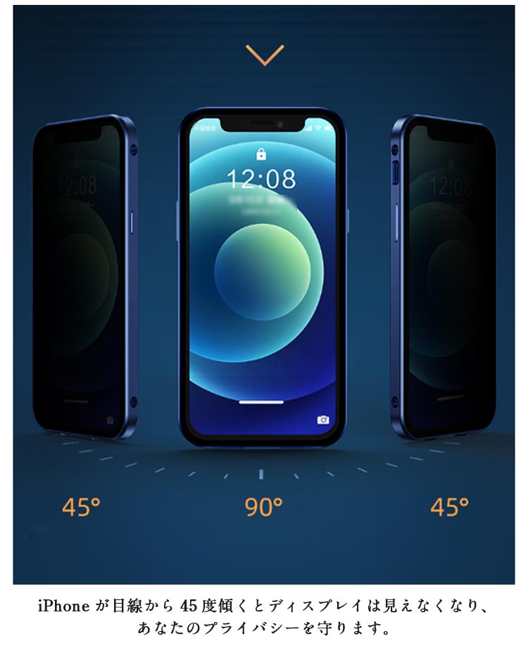 【覗き見防止・前後ガラスケース】iphoneケース。メタルの質感がたまらない、 全方向の衝撃からiPhoneを守る。薄型・軽量設計でありながら、メタル製パンパーとガラス製前後プレートを配備した2ピース構造となっており、iPhone本体特有の演出を損なうことなく表現出来るケースです。左右2方向の覗き見防止機能が 電車や公共の場所でプライバシ。電車や人が混み合う公共の場で、安心してiPhoneを楽しむことがで きるようになりました。iPhoneが目線から45度傾くとディスプレイは見えなくなり、あなたのプライバシーを守ります。飛び出たカメラレンズを傷から守る。高級感を損なわない一体感を実現、カメラレンズの保護フィルムと保護リングを一体にした設計。スクリーンを守るための全面設計!スクリーンプロテクターの部分に採用されている強化 ガラスはハード素材製でありながら、薄さと、しなやかさを併せ持っています。斬新な設計による簡単装着・脱着!左右のロックでケースの前後パーツをしっかり固定 万が一落下しても本体がケースから飛び出す心配なし。