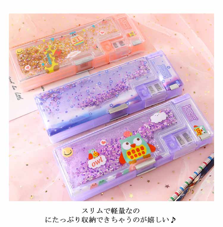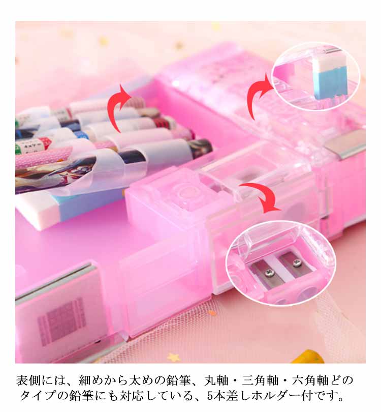 | キラキラのスパンコール入れたデザインでおしゃれなペンケース。 鉛筆削り付き大容量な筆箱。 両面開きで使いやすいボックス型。 スリムで軽量なのにたっぷり収納できちゃうのが嬉しい? たっぶり収納できる2ドアタイプ! 表側には、細めから太めの鉛筆、丸軸?三角軸?六角軸どのタイプの鉛筆にも対応している、5本差しホルダー付です。 大きめの消しゴムが入るスペースもあります。 裏側には、定規や分度器などの小物も収納できます。 機能性はバッチリなので大活躍間違いなし。 マグネット式で開閉が便利? 取り外して使える便利な鉛筆削り付き! | |