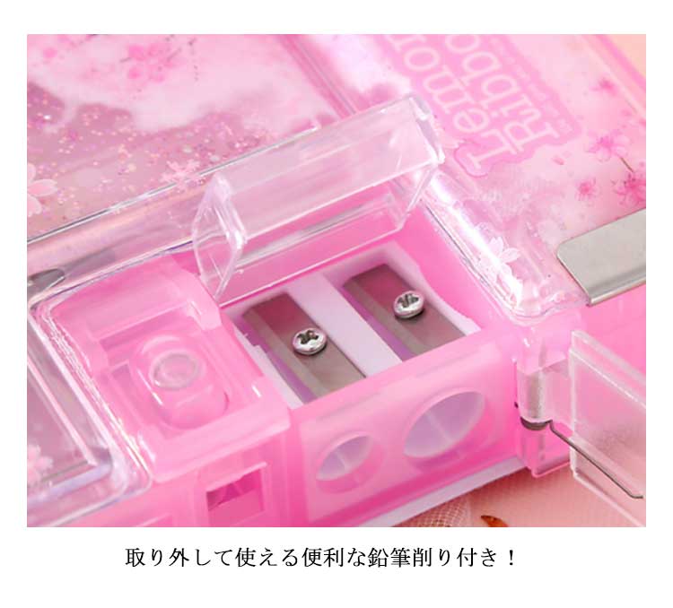キラキラのスパンコール入れたデザインでおしゃれなペンケース。鉛筆削り付き大容量な筆箱。両面開きで使いやすいボックス型。スリムで軽量なのにたっぷり収納できちゃうのが嬉しい♪たっぶり収納できる2ドアタイプ!表側には、細めから太めの鉛筆、丸軸・三角軸・六角軸どのタイプの鉛筆にも対応している、5本差しホルダー付です。大きめの消しゴムが入るスペースもあります。裏側には、定規や分度器などの小物も収納できます。機能性はバッチリなので大活躍間違いなし。マグネット式で開閉が便利♪取り外して使える便利な鉛筆削り付き!