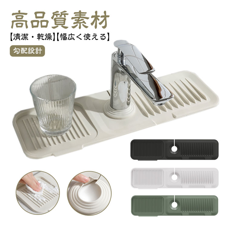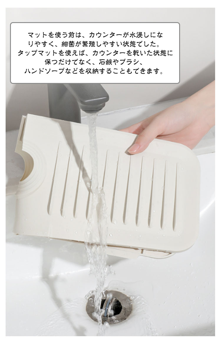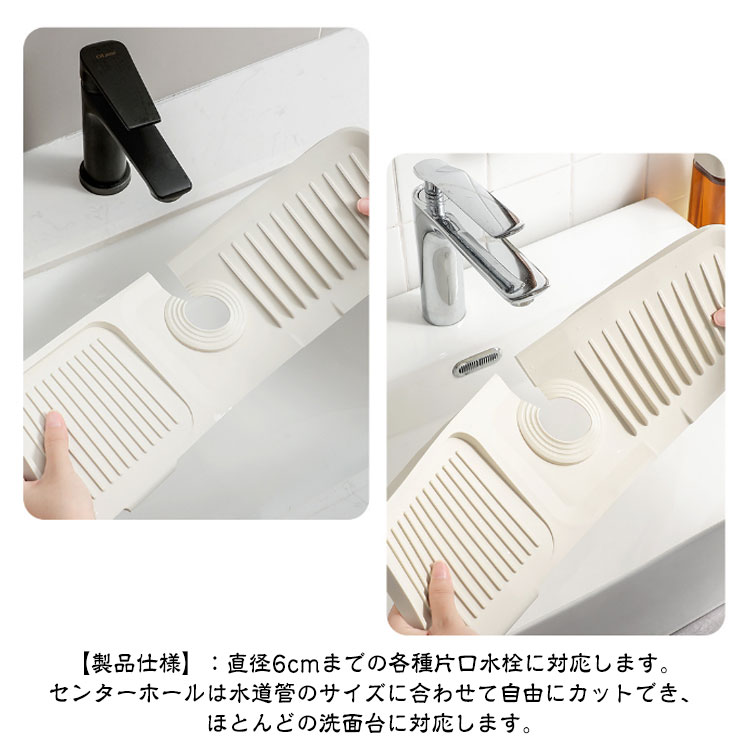 【製品仕様】:直径6cmまでの各種片口水栓に対応します。 センターホールは水道管のサイズに合わせて自由にカットでき、ほとんどの洗面台に対応します。【勾配設計】:タップスプラッシュガードマットは5°の勾配排水を設計し、水が素早くシンクに排水されるので、マットやカウンターに水が残る心配がありません。【高品質素材】:蛇口マットは高品質の食品グレードのシリコンで作られ、防水性、滑り止め、耐熱性に優れています。 より厚く、より耐久性のあるようにアップグレードされています。 濡れた布のマットとは異なり、シリコンマットはより安全で衛生的です。【清潔・乾燥】:マットを使う前は、カウンターが水浸しになりやすく、細菌が繁殖しやすい状態でした。 タップマットを使えば、カウンターを乾いた状態に保つだけでなく、石鹸やブラシ、ハンドソープなどを収納することもできます。【幅広く使える】:吸水性のあるマットはシンクにまとわりつき、簡単に滑り落ちないので、キッチンのシンク、バスルーム、ドレッシングテーブル、キャラバンなどに適しています。 お手入れは簡単で、タップマットを水で洗い流すだけです。