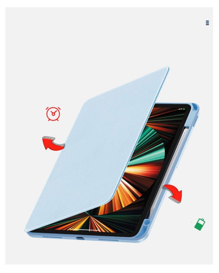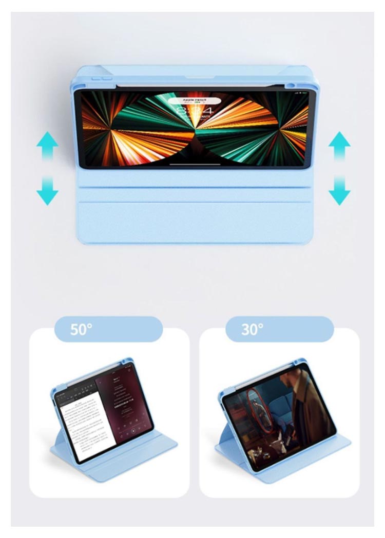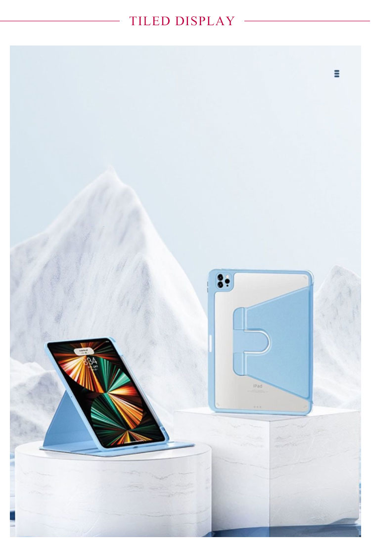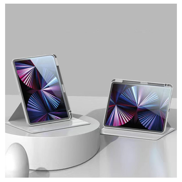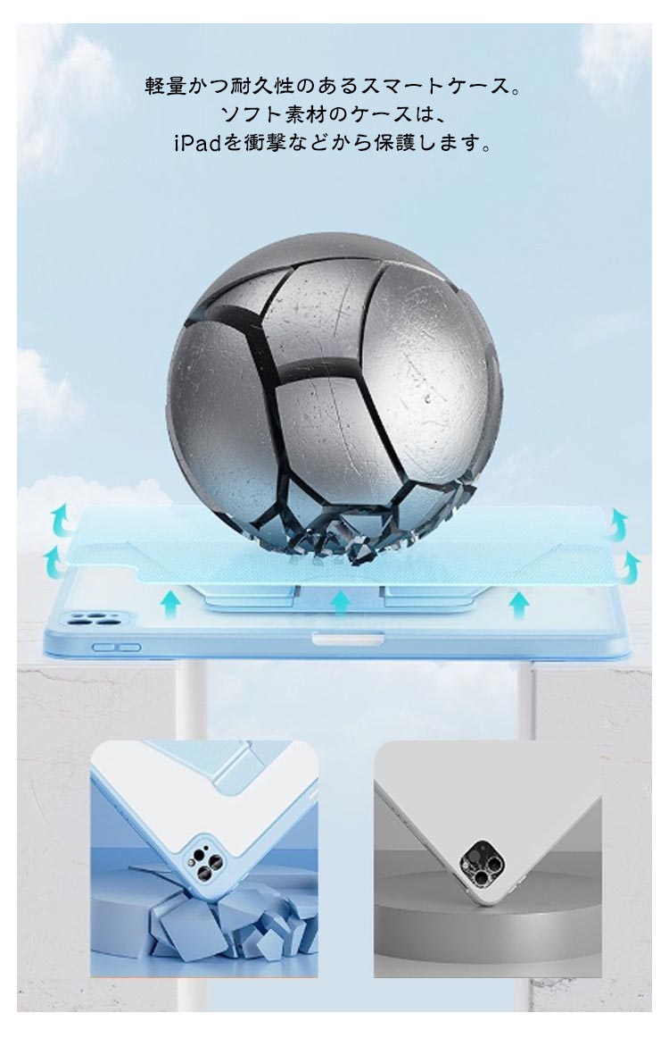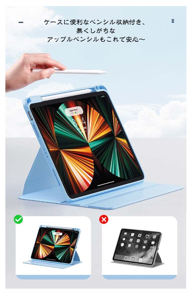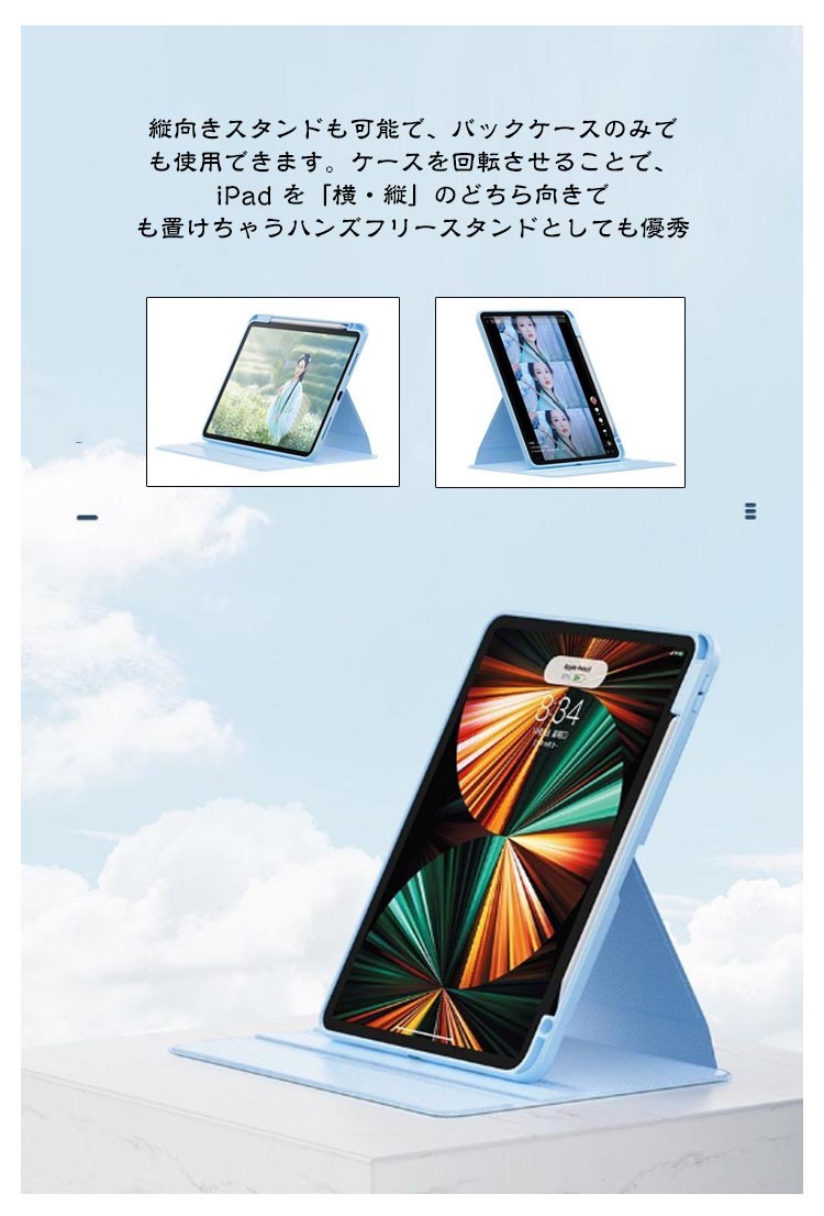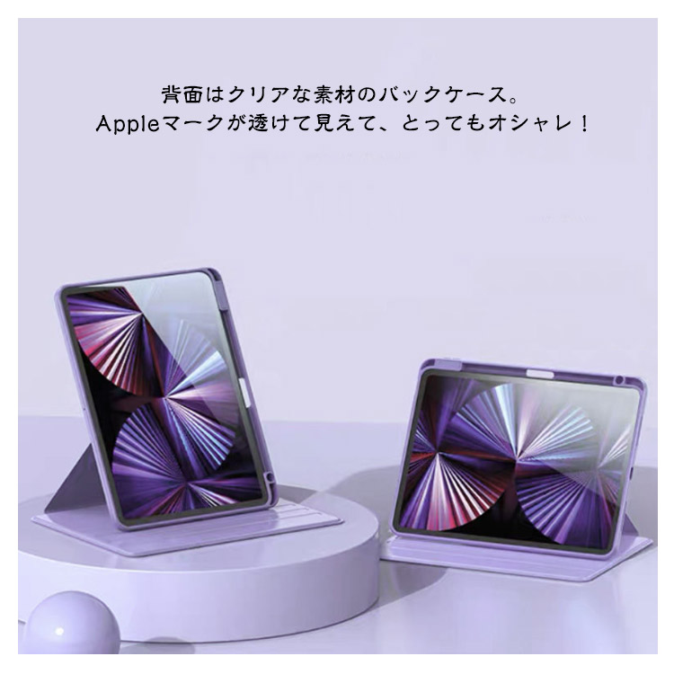 アイパッドの傷付き防止やiPadを衝撃から保護するスタンドケース縦向きスタンドも可能で、バックケースのみでも使用できます。ケースを回転させることで、 iPad を「横・縦」のどちら向きでも置けちゃうハンズフリースタンドとしても優秀背面はクリアな素材のバックケース。Appleマークが透けて見えて、とってもオシャレ!ケースに便利なペンシル収納付き、無くしがちなアップルペンシルもこれで安心~軽量かつ耐久性のあるスマートケース。ソフト素材のケースは、iPadを衝撃などから保護します。