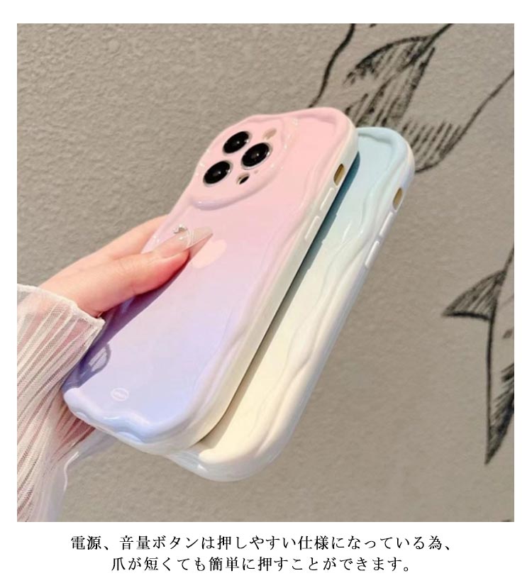 【素材】柔軟で衝撃吸収性のあるTPU素材を使用。しなやかで弾力のある素材は端末の着脱も楽ちんです。【デザイン】流行りのウェーブのようなうねうねフレームアイフォンケース。【かわいい】いまSNSで話題の可愛いiPhoneケースです。【押しやすい】電源、音量ボタンは押しやすい仕様になっている為、爪が短くても簡単に押すことができます。