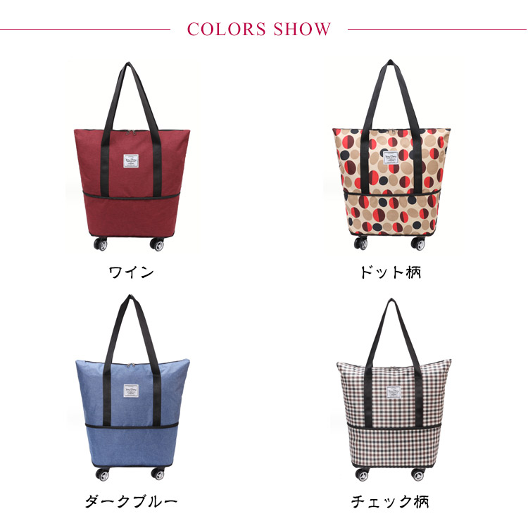 【4輪・2WAY】【折り畳み可・拡張可】【7color】軽くてコンパクトな折りたたみ式4輪タイプのショッピングカート。不要時はスリムな折りたたみ式!広げて使えば、大容量サイズのカートに変身です。毎日のショッピングはもちろん、ちょっとした旅行にも気軽に使えます。機内持ち込みも可能サイズ。4輪タイプで安定感抜群です。お年寄りにも安心。マチが広いので、ピザなど大型のお惣菜やホールケーキなども入り、持ち手が2本あるので安定して持ち運べます。スタイリッシュな見た目は、どんどん外に持って出かけたくなります。