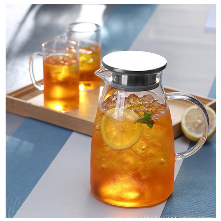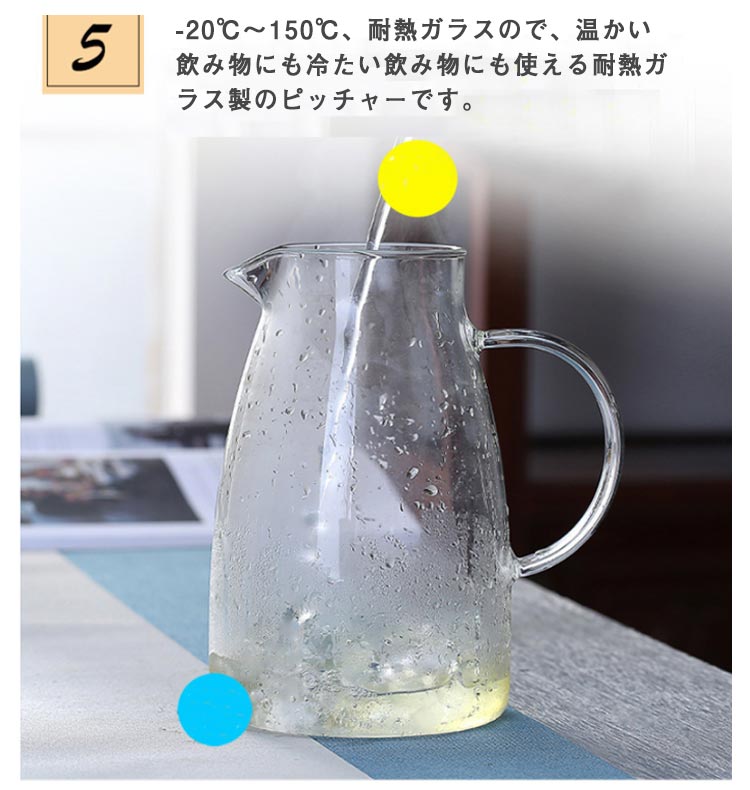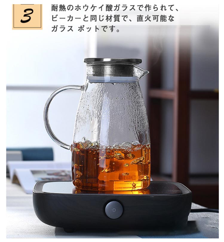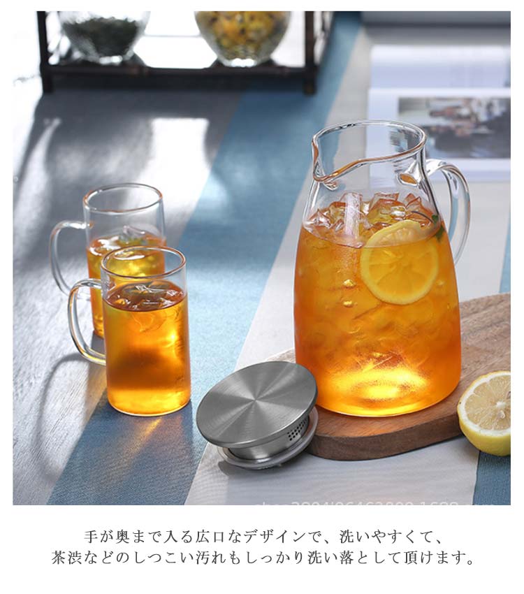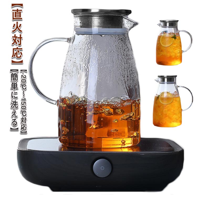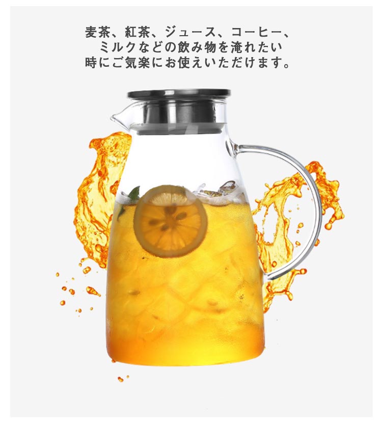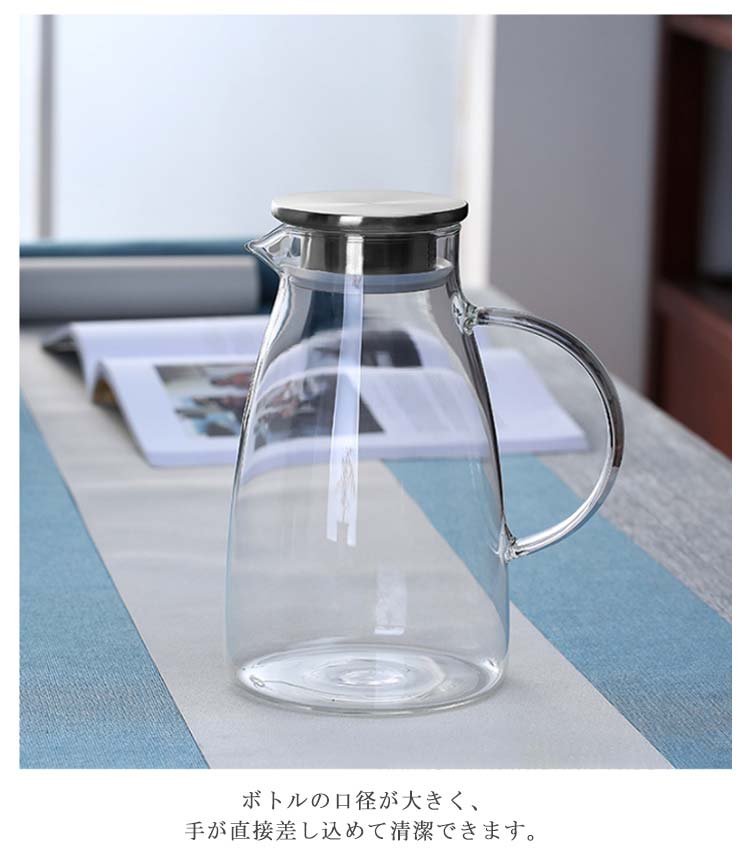【直火対応】耐熱のホウケイ酸ガラスで作られて、ビーカーと同じ材質で、直火可能なガラス ポットです。【簡単に洗える】ボトルの口径が大きく、手が直接差し込めて清潔できます。【-20℃~150℃対応】麦茶、紅茶、ジュース、コーヒー、ミルクなどの飲み物を淹れたい時にご気楽にお使えいただけます。-20℃~150℃、耐熱ガラスので、温かい飲み物にも冷たい飲み物にも使える耐熱ガラス製のピッチャーです。【洗いやすい】手が奥まで入る広口なデザインで、洗いやすくて、茶渋などのしつこい汚れもしっかり洗い落として頂けます。