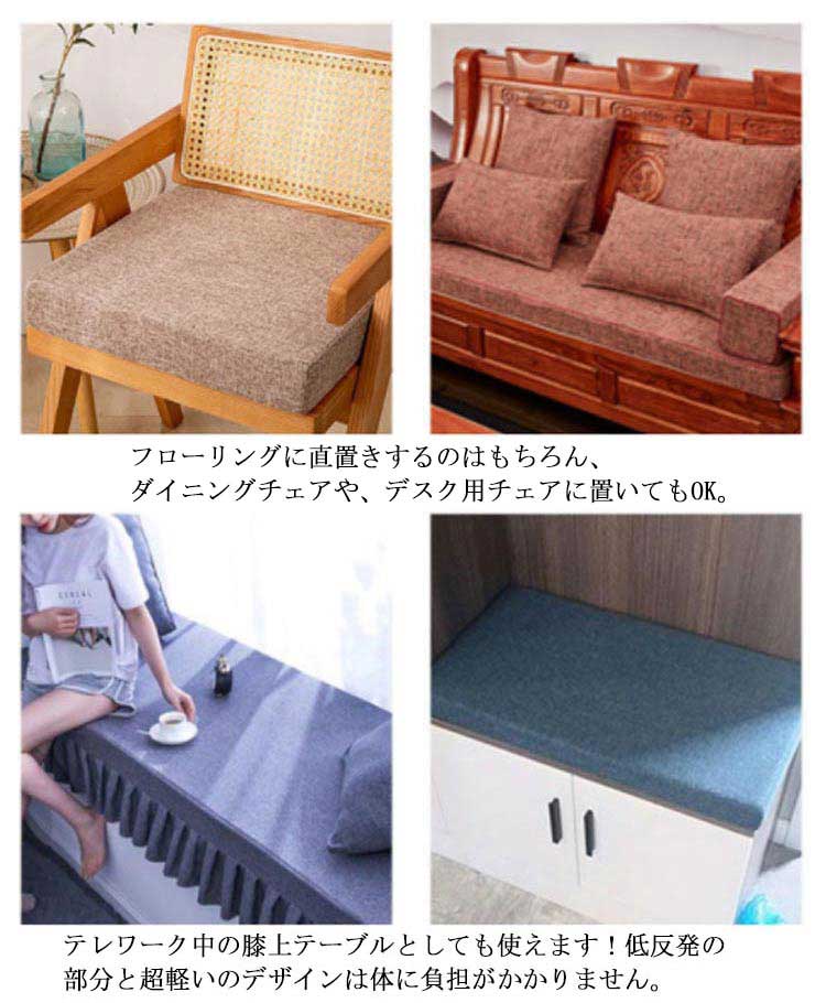低反発×高反発・座布団クッション。ファスナー付きでカバーが簡単に取り外して洗濯できます。フローリングに直置きするのはもちろん、ダイニングチェアや、デスク用チェアに置いてもOK。子供用の高さ調整クッションとしても使えます!椅子クッションとして長時間座っていてもお尻が痛くなりません。テレワーク中の膝上テーブルとしても使えます!低反発の部分と超軽いのデザインは体に負担がかかりません。