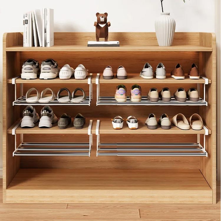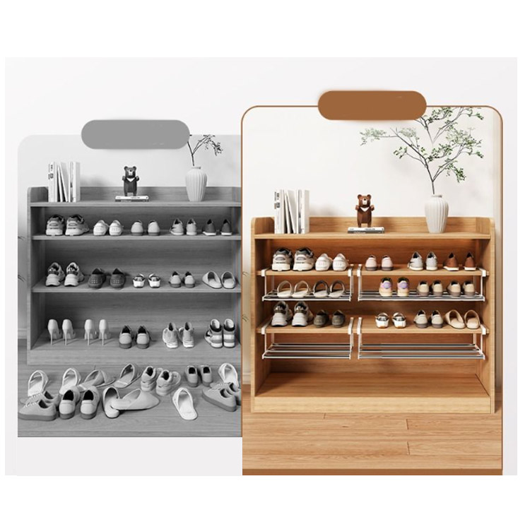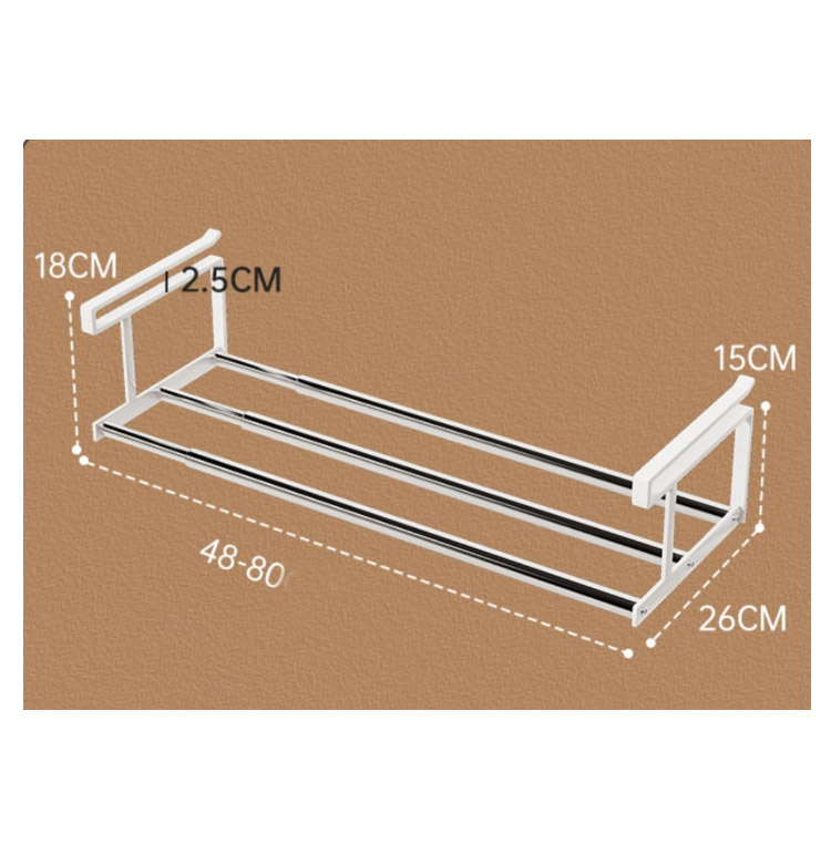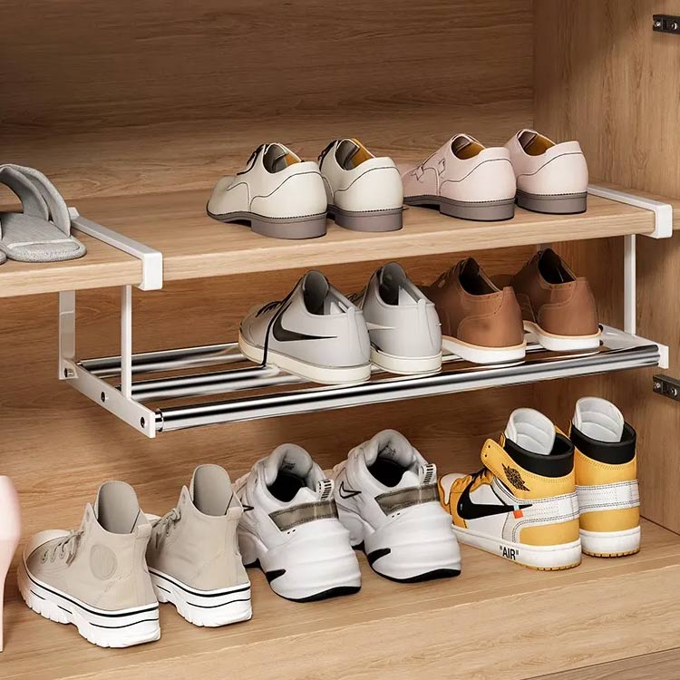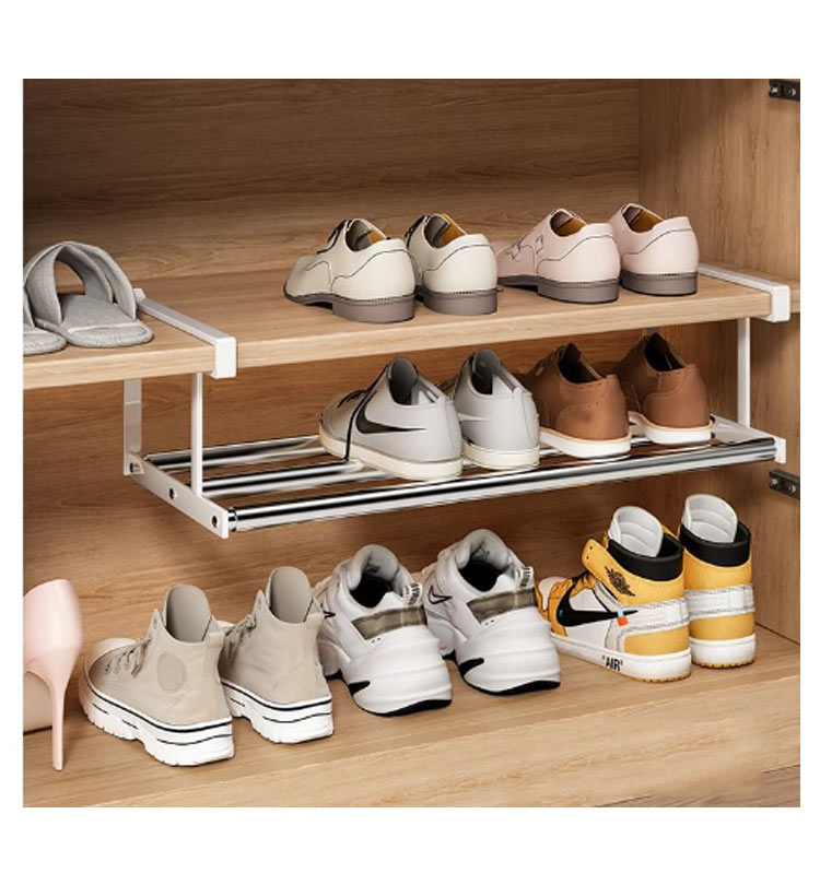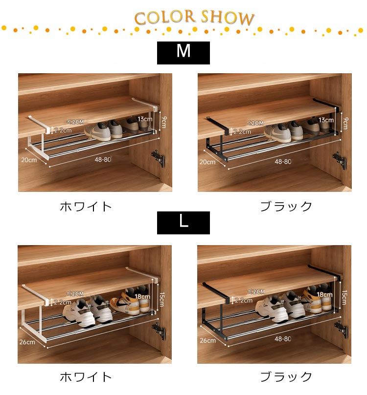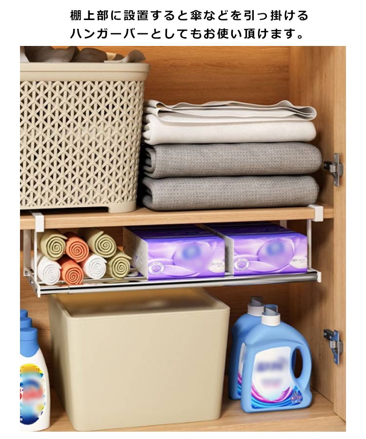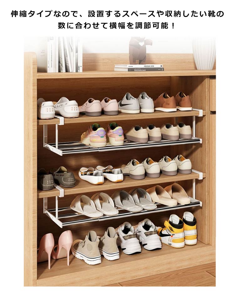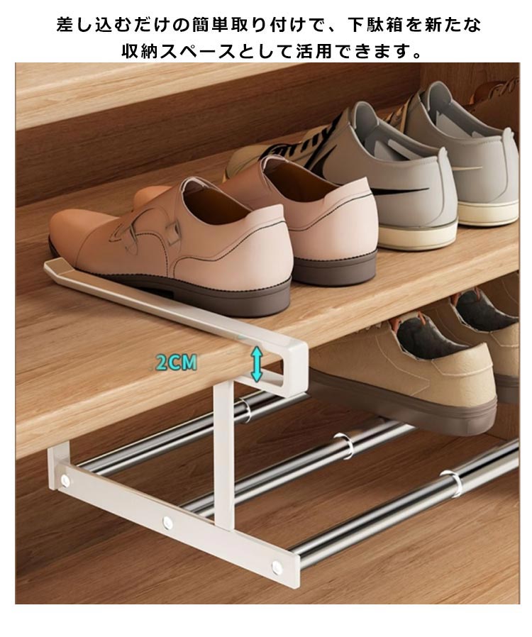 | 下駄箱の棚下に取り付けるだけでシューズ収納が広がる伸縮シューズラックです。 伸縮タイプなので、設置するスペースや収納したい靴の数に合わせて横幅を調節可能! 浮かせて収納できるから、抜群の通気性で靴にやさしく、お掃除もラクラク。 差し込むだけの簡単取り付けで、下駄箱を新たな収納スペースとして活用できます。 棚上部に設置すると傘などを引っ掛けるハンガーバーとしてもお使い頂けます。 | |