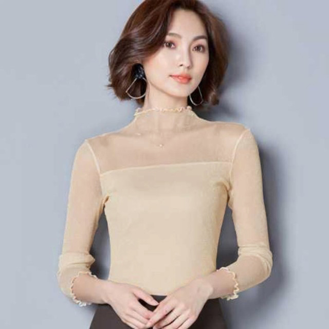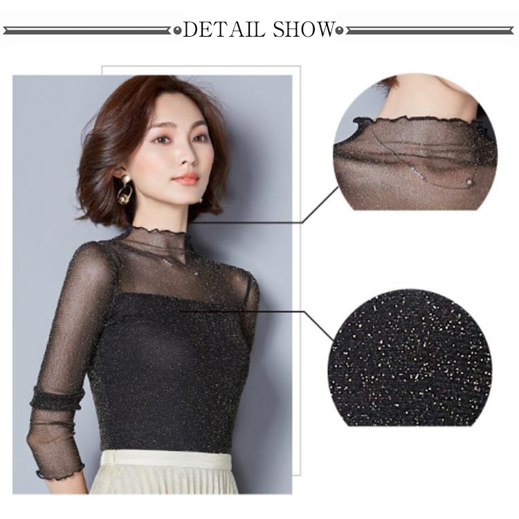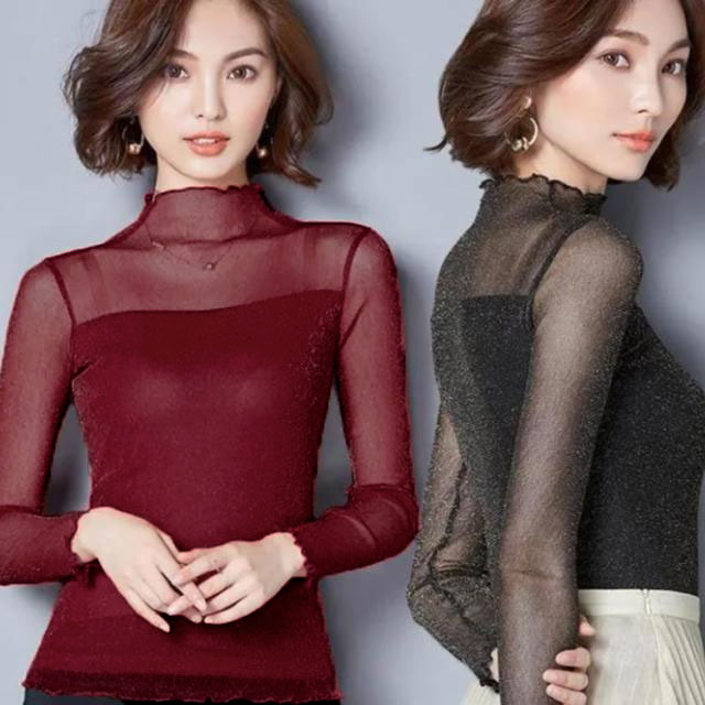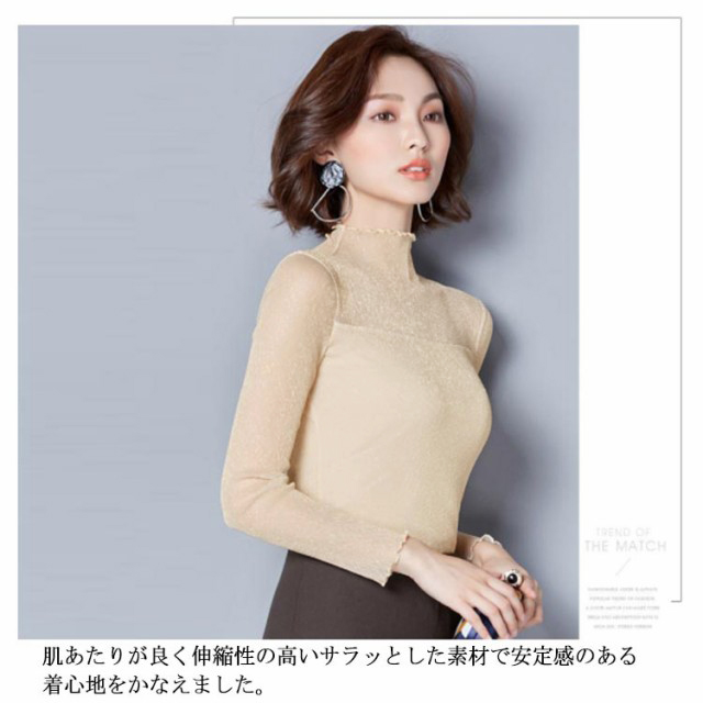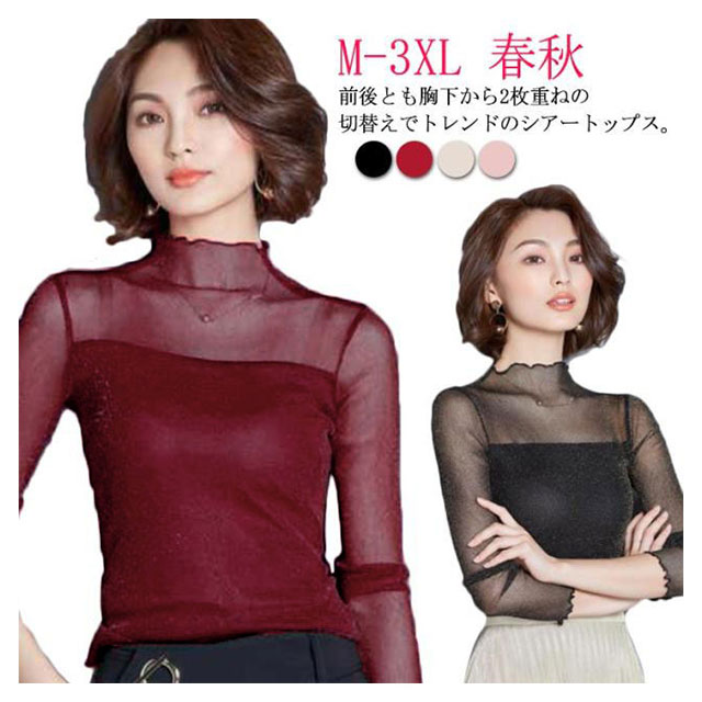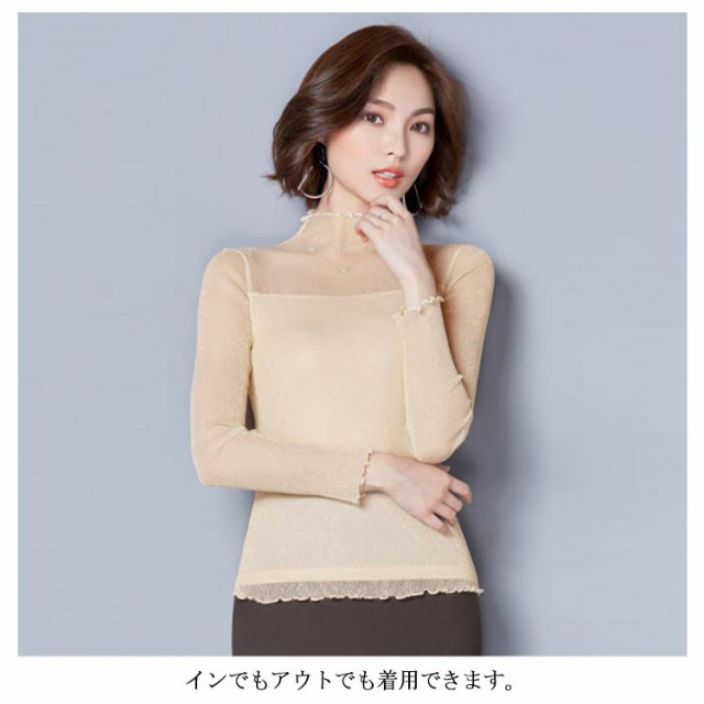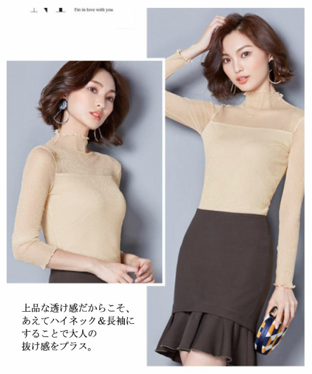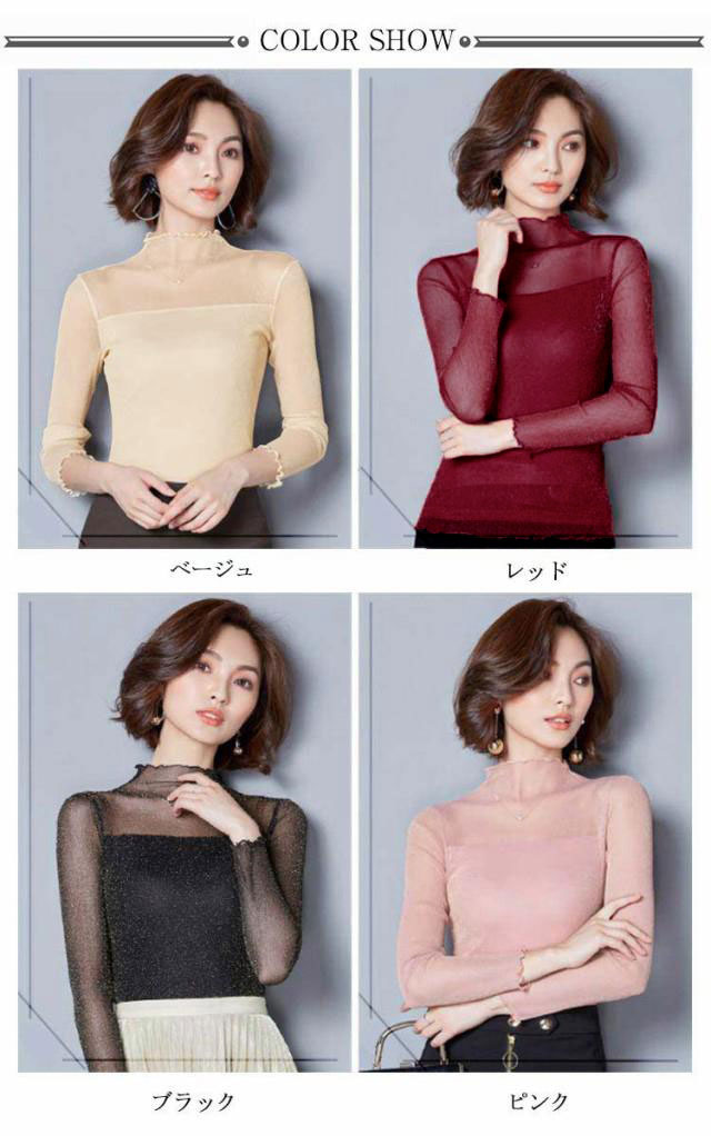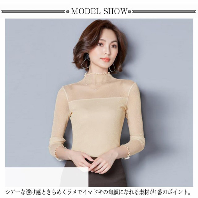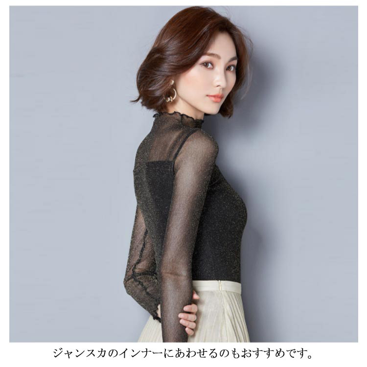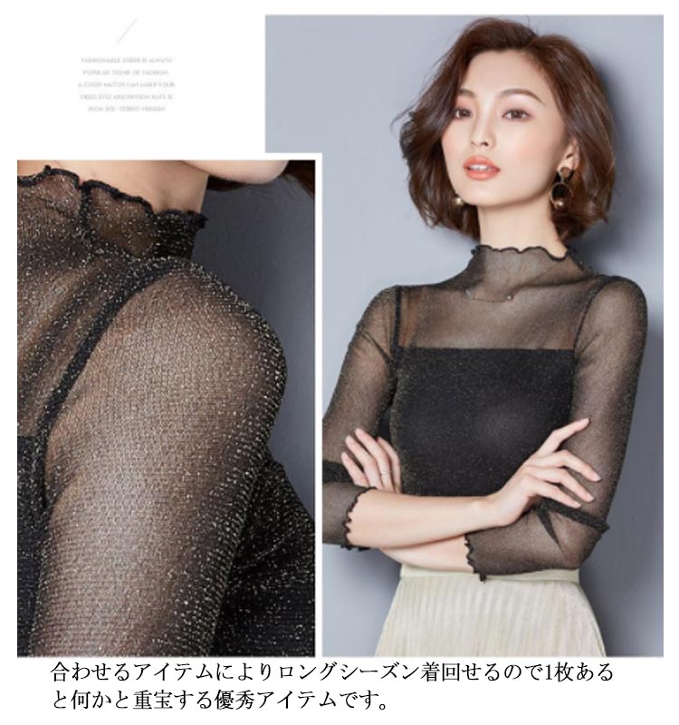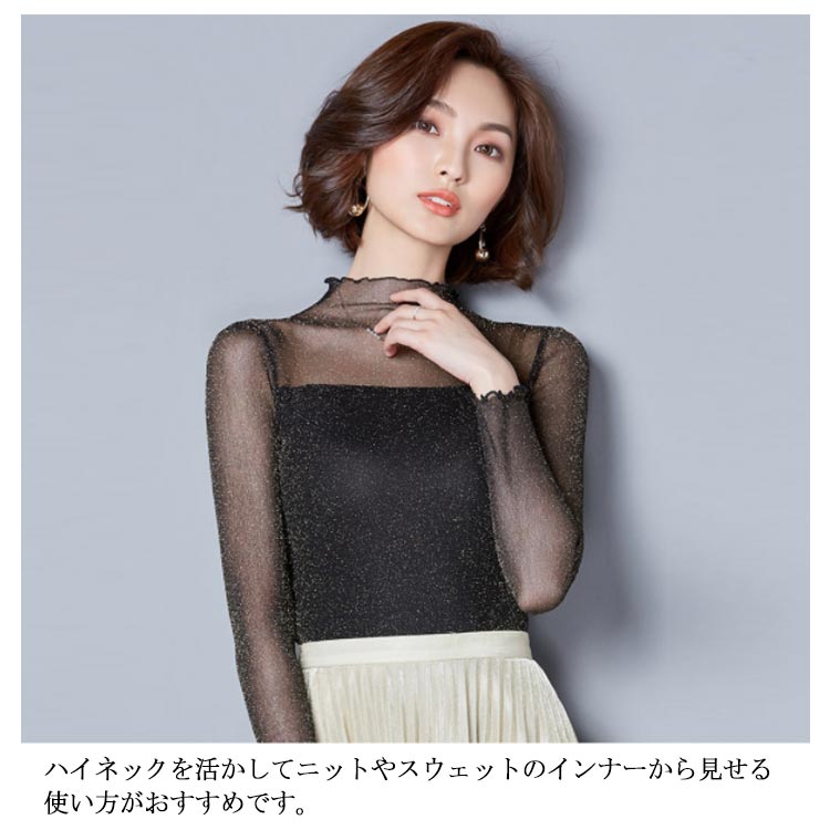 ・前後とも胸下から2枚重ねの切替えでトレンドのシアートップス。・シアーな透け感ときらめくラメでイマドキの旬顔になれる素材が1番のポイント。・上品な透け感だからこそ、あえてハイネック&長袖にすることで大人の抜け感をプラス。・肌あたりが良く伸縮性の高いサラッとした素材で安定感のある着心地をかなえました。・インでもアウトでも着用できます。・ハイネックを活かしてニットやスウェットのインナーから見せる使い方がおすすめです。・ジャンスカのインナーにあわせるのもおすすめです。・合わせるアイテムによりロングシーズン着回せるので1枚あると何かと重宝する優秀アイテムです。