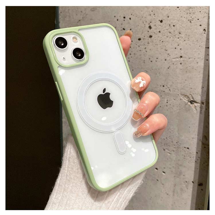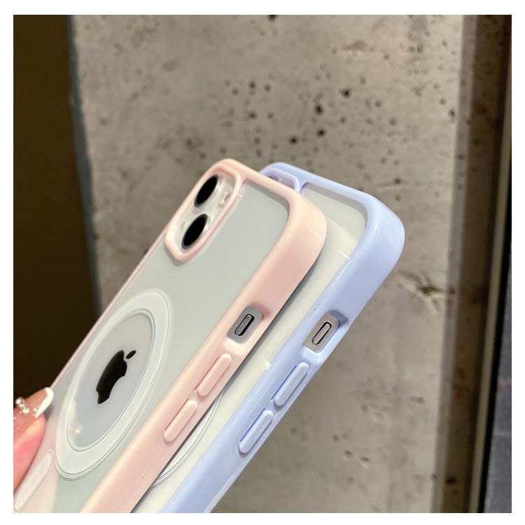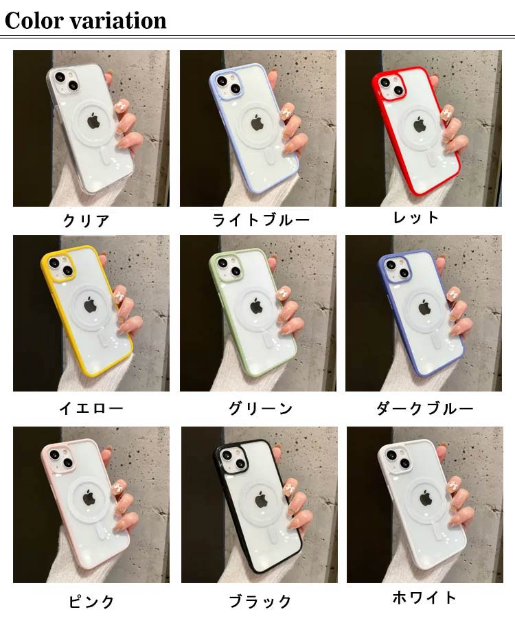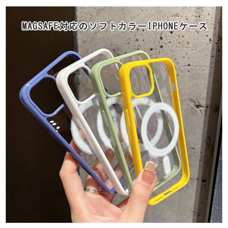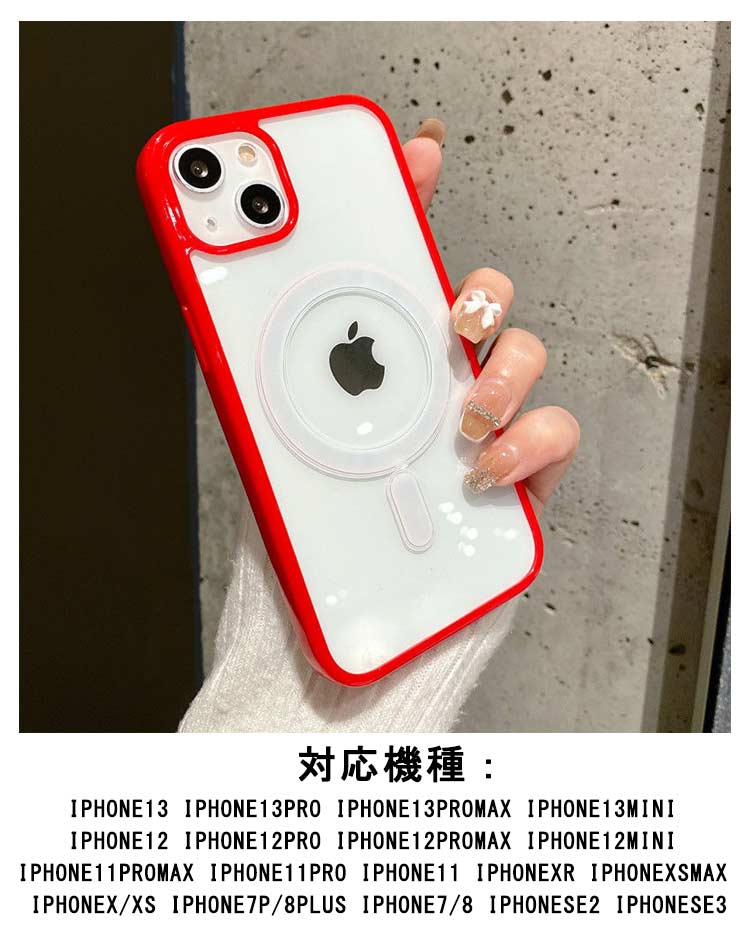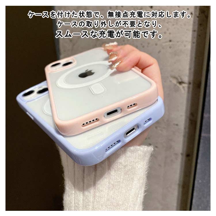 MagSafe対応のソフトカラーiPhoneケース側面は柔らかく衝撃を吸収するTPU素材、背面は頑丈で高透過率なPC素材。2種類の素材を組み合わせることによって不意な落下や、傷から端末をタフに守ります。ケースを付けた状態で、無接点充電に対応します。ケースの取り外しが不要となり、スムースな充電が可能です。対応機種:iPhone13 iPhone13Pro iPhone13ProMax iPhone13Mini iPhone12 iPhone12Pro iPhone12ProMax iPhone12mini iPhone11ProMax iPhone11Pro iPhone11 iPhoneXR iPhoneXsMax iPhoneX/XS iPhone7P/8Plus iPhone7/8 iPhoneSE2 iPhoneSE3
