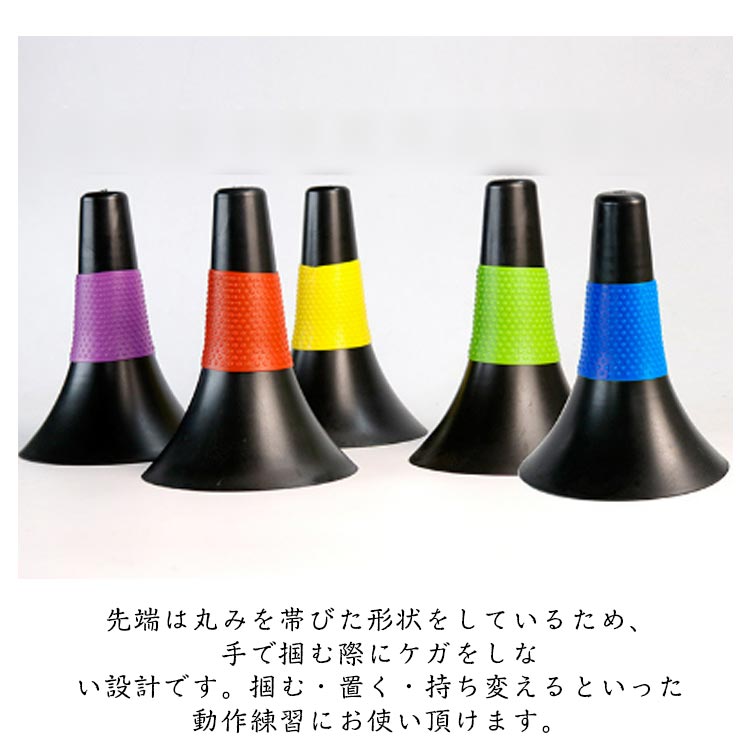 | バスケットボール?サッカー?フットサルなどのドリブル練習に重宝するリップコーン10個セットです。 ドリブルコースを作成したり、ハンドリングの練習に使用したりとトレーニングの幅を広げます。 ハンドリング練習の際にしっかり掴めるよう、凹凸加工されたグリップを完備しています。先端は丸みを帯びた形状をしているため、手で掴む際にケガをしない設計です。掴む?置く?持ち変えるといった動作練習にお使い頂けます。 先端から下に向かって末広がりになっており倒れにくい安定感も魅力です。トレーニング中に足やボールが当たっても倒れにくく、練習の手を止めません。 使用後は重ねておけるので省スペースで保管できます。 | |