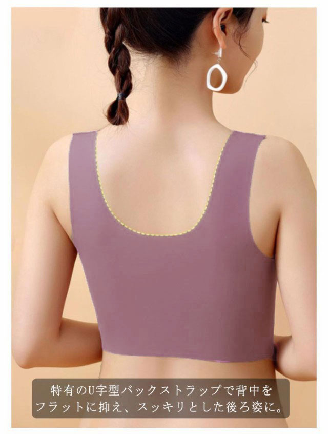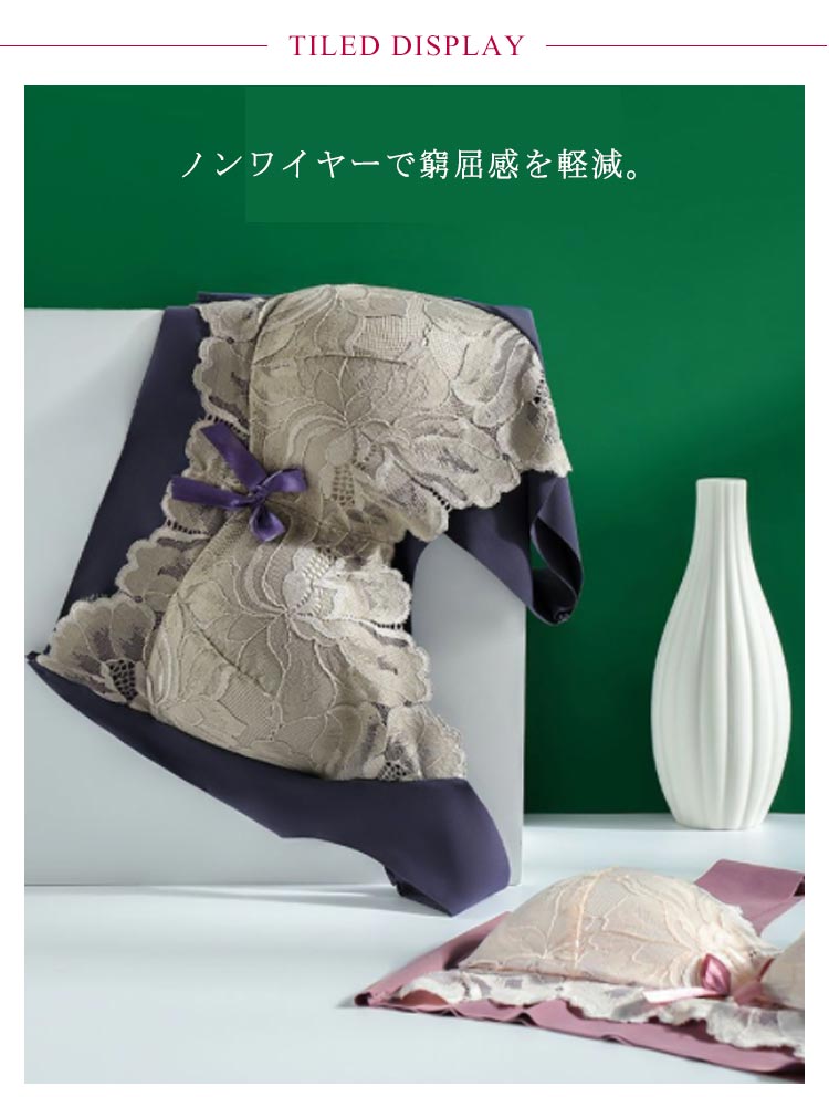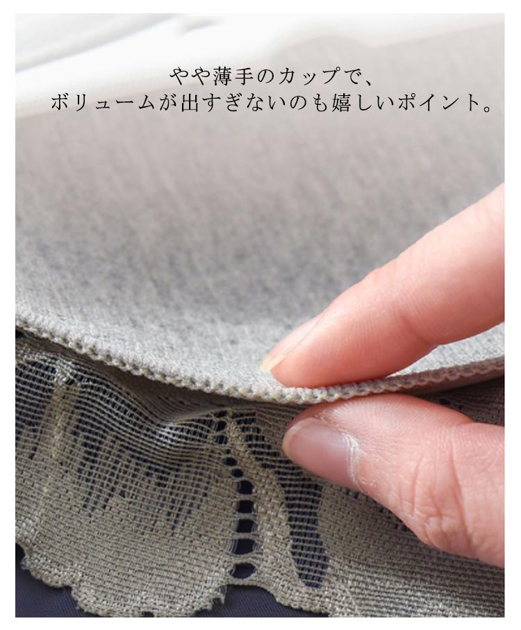 | 着用感ゼロ!大きな胸を小さく見せるブラ。 やや薄手のカップで、ボリュームが出すぎないのも嬉しいポイント。 ノンワイヤーで窮屈感を軽減。 花柄レースがしっかり胸をつつんで綺麗なシルエットを作ります。 脇高仕様で脇のお肉をしっかりとおさえ、大きな胸のすっきり細見えを実現します。 ストラップも太目仕様なので、肩への食い込みも軽減されます。 特有のU字型バックストラップで背中をフラットに抑え、スッキリとした後ろ姿に。 | |