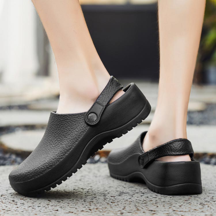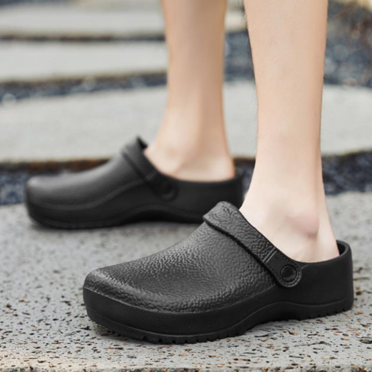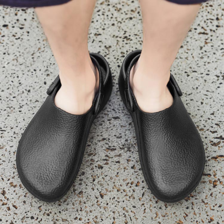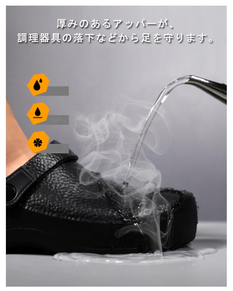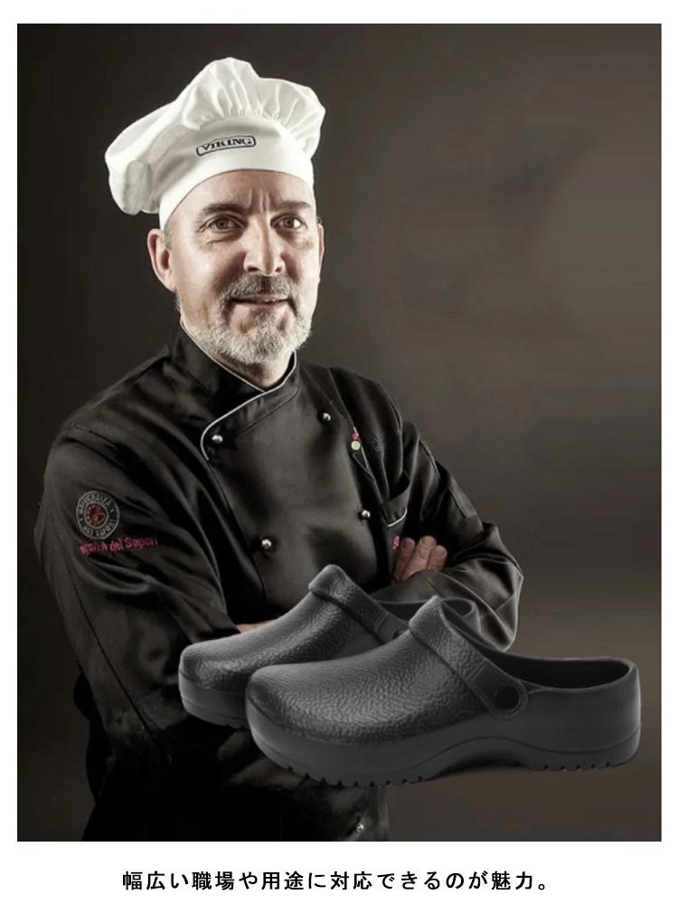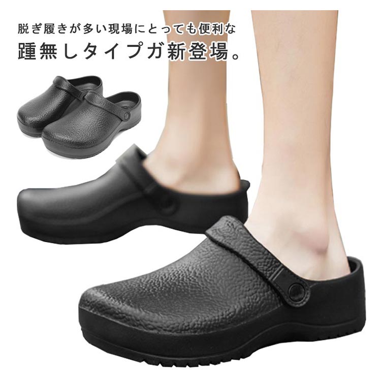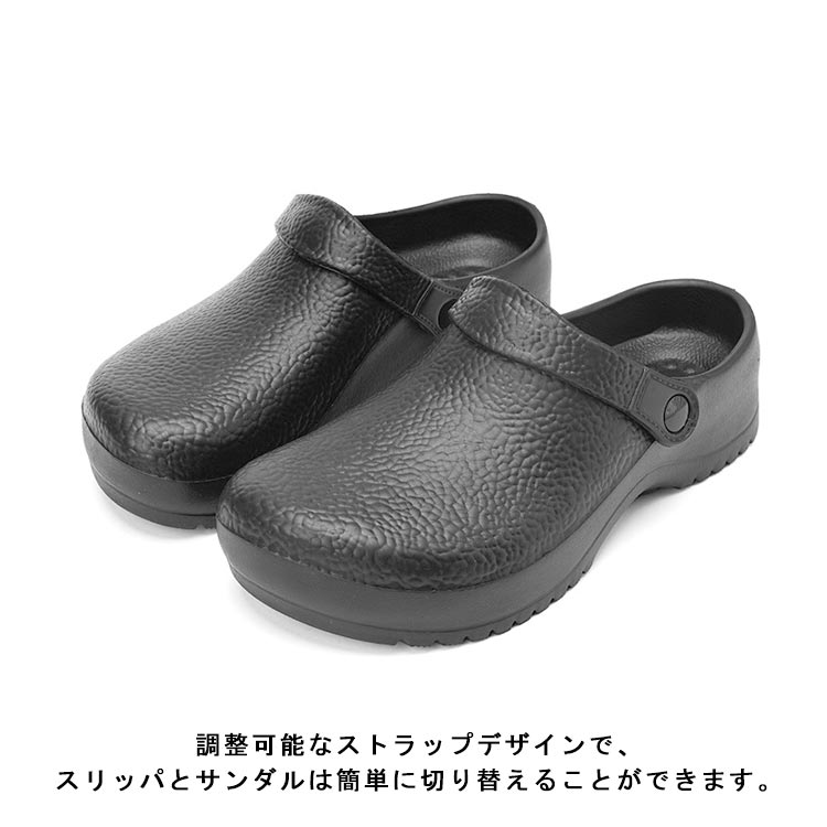 脱ぎ履きが多い現場にとっても便利な踵無しタイプガ新登場。水・油に強く、安心して作業ができるので、厨房などで大活躍。厚みのあるアッパーが、調理器具の落下などから足を守ります。調整可能なストラップデザインで、スリッパとサンダルは簡単に切り替えることができます。防水性と軽量性があり、快適な一日を演出します。幅広い職場や用途に対応できるのが魅力。