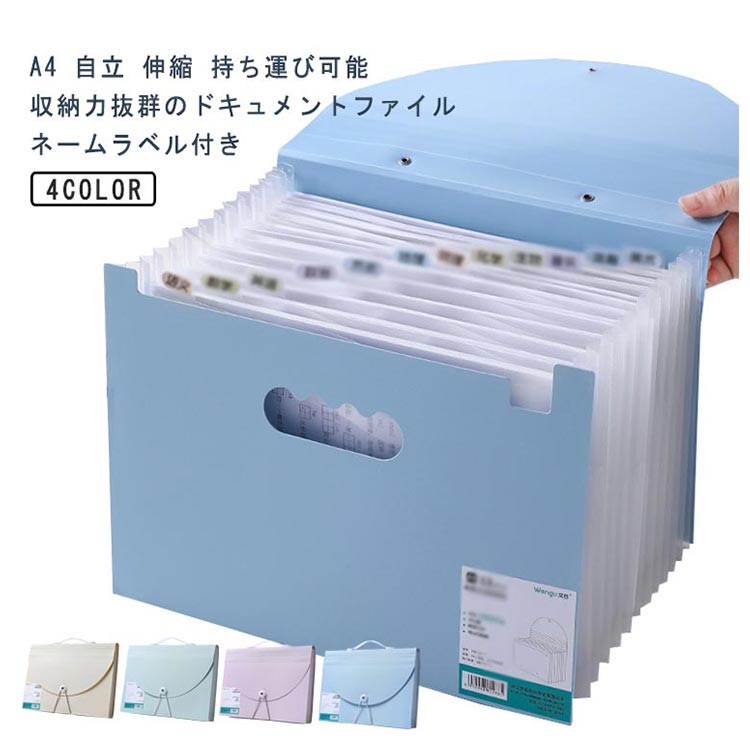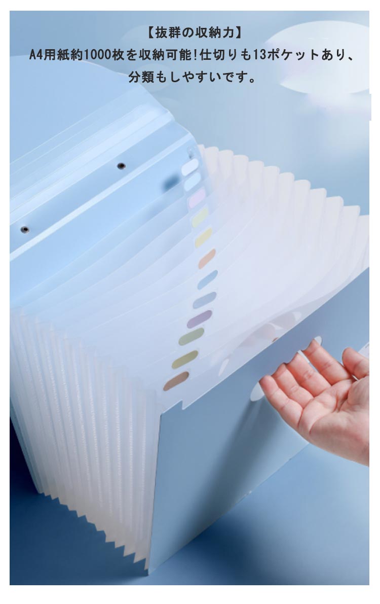 A4 自立 伸縮 持ち運び可能収納力抜群のドキュメントファイルネームラベル付き【抜群の収納力】A4用紙約1000枚を収納可能!仕切りも13ポケットあり、分類もしやすいです。【伸び縮みするじゃばら構造】13つポケットは大きく広がり、書類の出し入れがらくらく♪【仕分けに便利なインデックスつき】付属のインデックスシールで項目別に分類OKほしい資料がすぐに取り出せます!種類・家族・年度別などの仕分けに便利。切り取り線が入った厚紙タイプで使いやすい。【防水性もある丈夫な素材】表面には、水や汚れに強い丈夫なPP素材を採用。サッと拭けばすぐに綺麗をキープ。【ゴムバンドでコンパクトに】作業後は、書類が増えて膨らんでも、ゴムバンドでしっかり留められます。【便利な持ち手つき】持ちやすい取っ手つきで、持ち運びもラクラク!【シンプルで使いやすいデザイン】インテリアにも馴染み、ビジネスシーンでも活躍します!