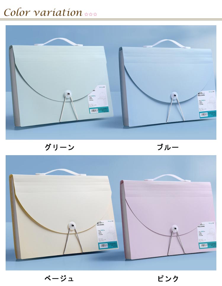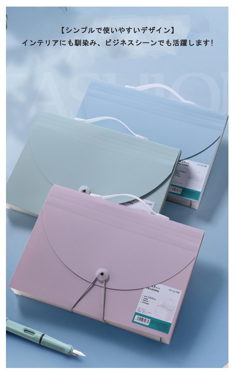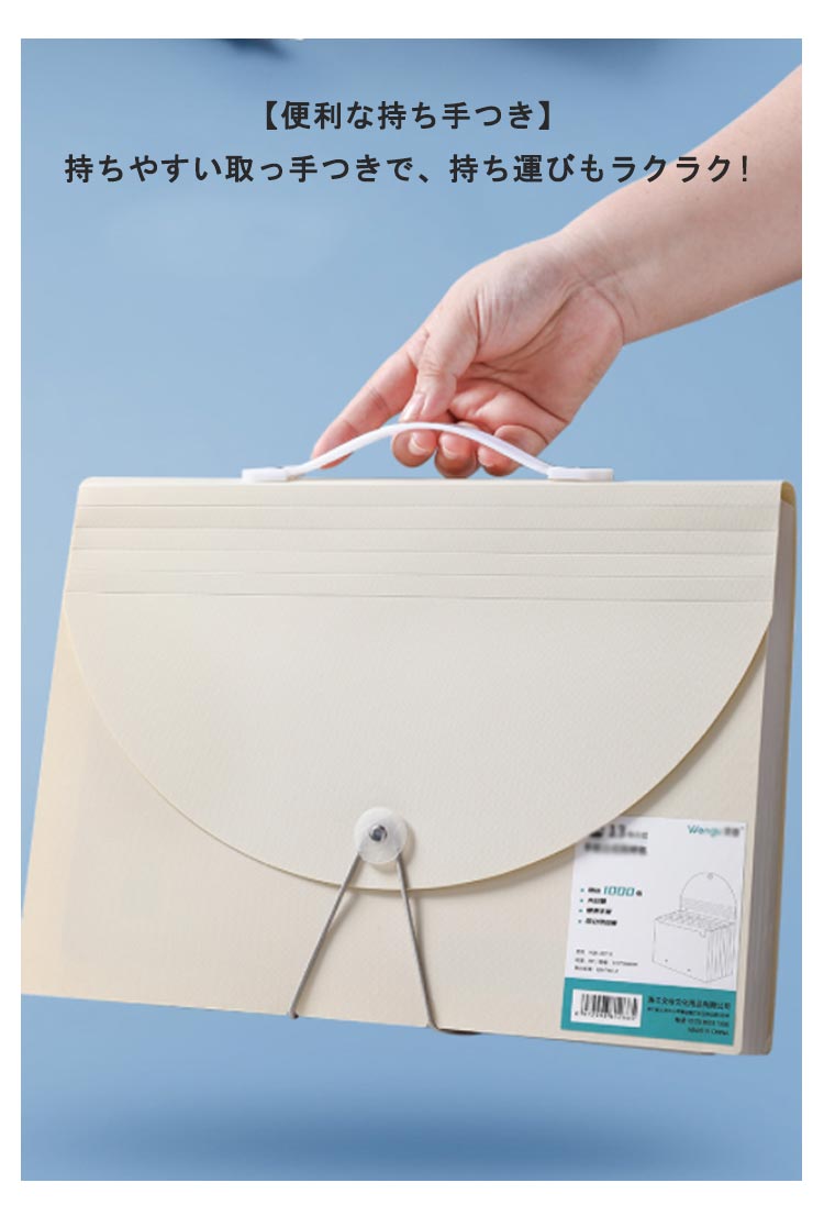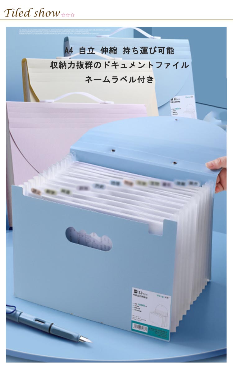 | A4 自立 伸縮 持ち運び可能 収納力抜群のドキュメントファイル ネームラベル付き 【抜群の収納力】 A4用紙約1000枚を収納可能!仕切りも13ポケットあり、分類もしやすいです。 【伸び縮みするじゃばら構造】 13つポケットは大きく広がり、書類の出し入れがらくらく? 【仕分けに便利なインデックスつき】 付属のインデックスシールで項目別に分類OKほしい資料がすぐに取り出せます! 種類?家族?年度別などの仕分けに便利。切り取り線が入った厚紙タイプで使いやすい。 【防水性もある丈夫な素材】 表面には、水や汚れに強い丈夫なPP素材を採用。サッと拭けばすぐに綺麗をキープ。 【ゴムバンドでコンパクトに】 作業後は、書類が増えて膨らんでも、ゴムバンドでしっかり留められます。 【便利な持ち手つき】 持ちやすい取っ手つきで、持ち運びもラクラク! 【シンプルで使いやすいデザイン】 インテリアにも馴染み、ビジネスシーンでも活躍します! | |