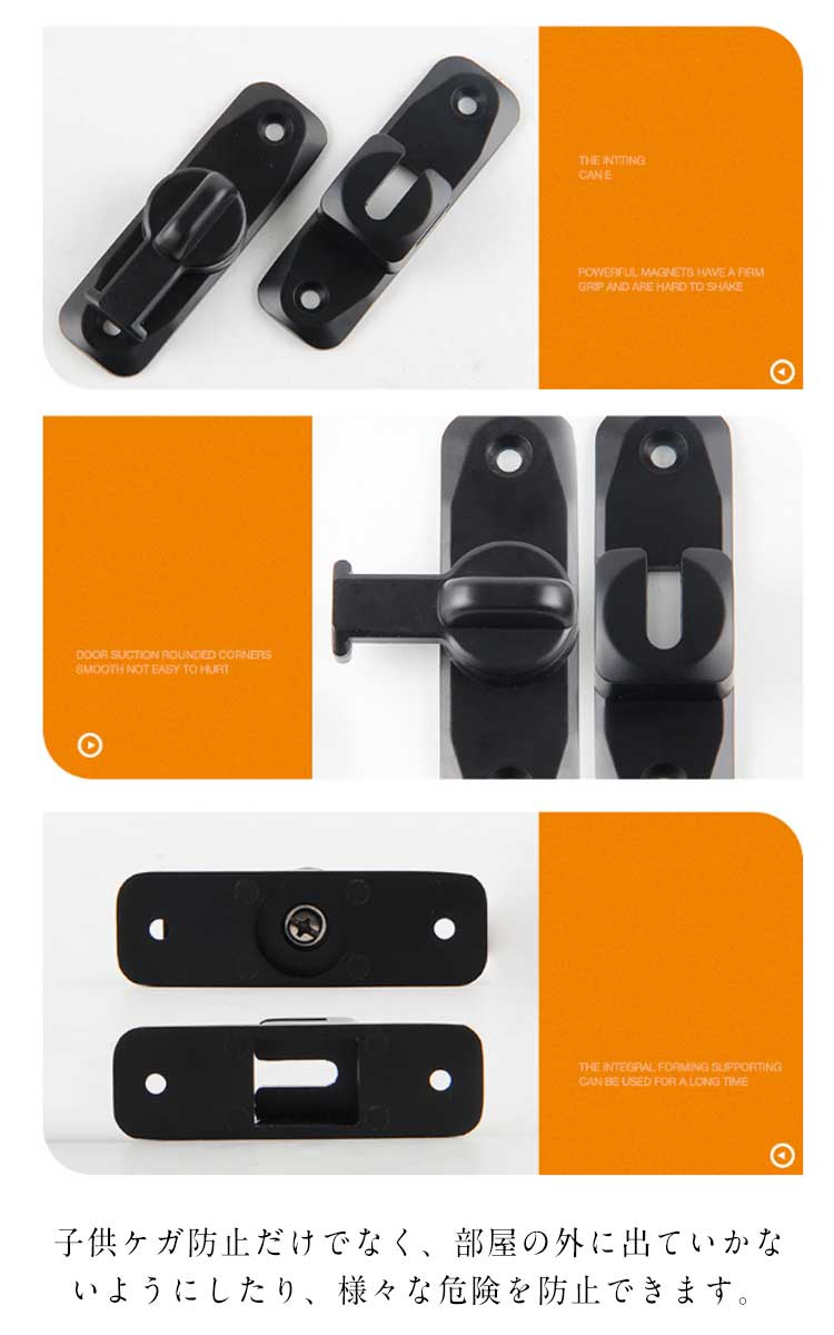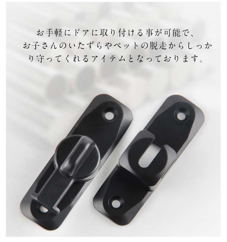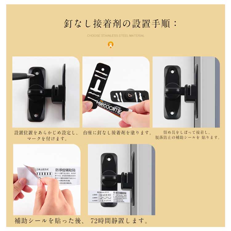 ドアや窓のセキュリティーに役立つ後付けドアロック。ねじでしっかり固定するタイプですので、丈夫で長持ちとなっております。お手軽にドアに取り付ける事が可能で、お子さんのいたずらやペットの脱走からしっかり守ってくれるアイテムとなっております。また、90度も180度も取り付けられるから、開き戸も引き戸も様々なドアに対応できます。子供ケガ防止だけでなく、部屋の外に出ていかないようにしたり、様々な危険を防止できます。簡単施錠でスライドドアの防犯対策ができます。猫の脱走防止用としてもお使いいただけます。 釘なし接着剤の設置手順:設置位置をあらかじめ設定し、 マークを付けます。台座に釘なし接着剤を塗ります。留め具をしぼって接着し、 脱落防止の補助シールを 貼ります。補助シールを貼った後、 72時間静置します。