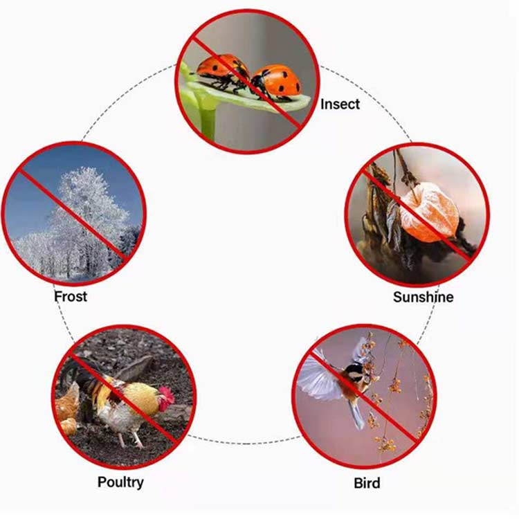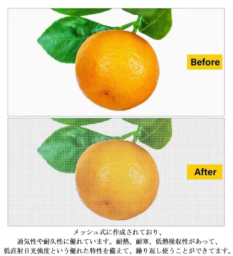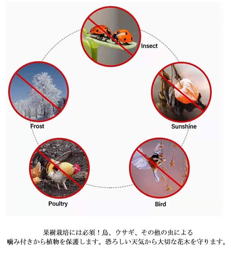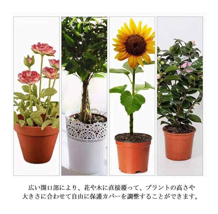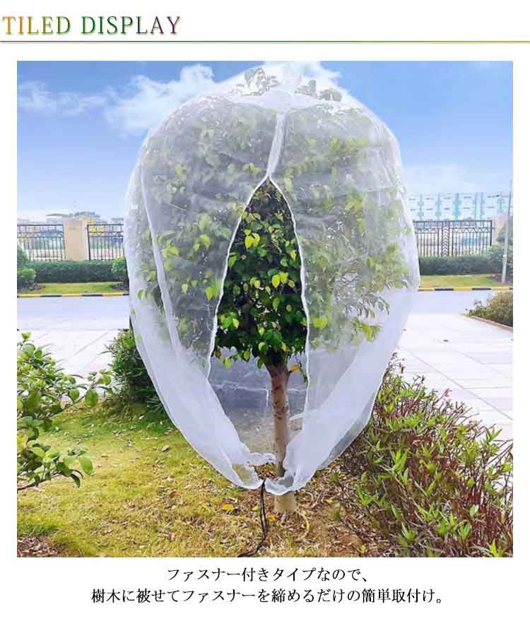 | メッシュ式に作成されており、通気性や耐久性に優れています。耐熱、耐寒、低熱吸収性があって、低直射日光強度という優れた特性を備えて、繰り返し使うことができてます。 PE素材で作らて、環境に優しい、通気性に優れた、耐久性があります、繰り返し使うことができます。長期間使用しても損傷しない。 果樹栽培には必須!鳥、ウサギ、その他の虫による噛み付きから植物を保護します。恐ろしい天気から大切な花木を守ります。 透気生地は植物が窒息しているか、あるいは光合成を妨げることはありません。 花、野菜、観葉植物や鉢植えなどの植物に覆い。 ファスナー付きタイプなので、樹木に被せてファスナーを締めるだけの簡単取付け。 広い開口部により、花や木に直接覆って、プラントの高さや大きさに合わせて自由に保護カバーを調整することができます。 | |