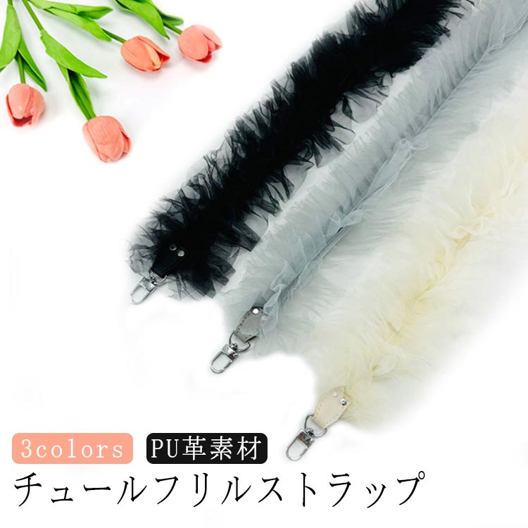 【チュールフリルストラップ】【3colors】【PU革素材】トレンドのチュール素材を贅沢に重ね、スタイリングにフェミニンさを演出してくれるショルダーストラップ。金具の繋ぎ部分はつけやすい仕様、PU(合成皮革)素材で作られており、高品質で耐久性があります。お手持ちのスマホケースと組み合わせてスマホショルダーとしても素敵です。スマホ、ミニバッグ、ハンディファンなどとのコーディネートにぴったり。トレンドのたっぷりギャザーがカワイイコーデの主役級に映える