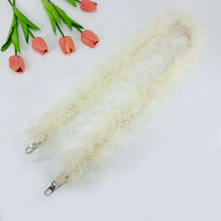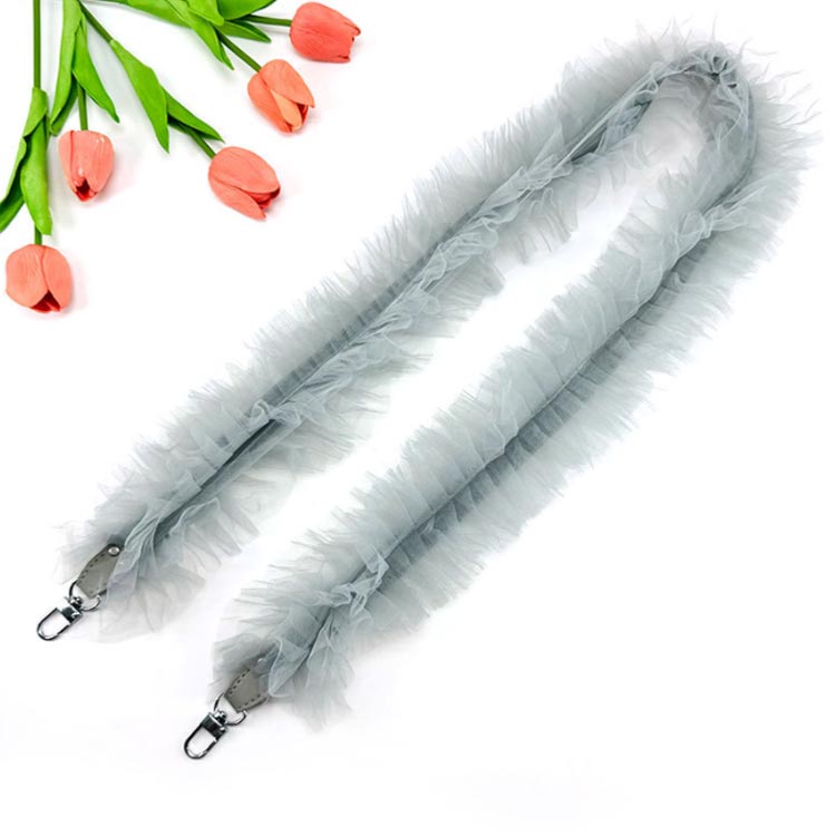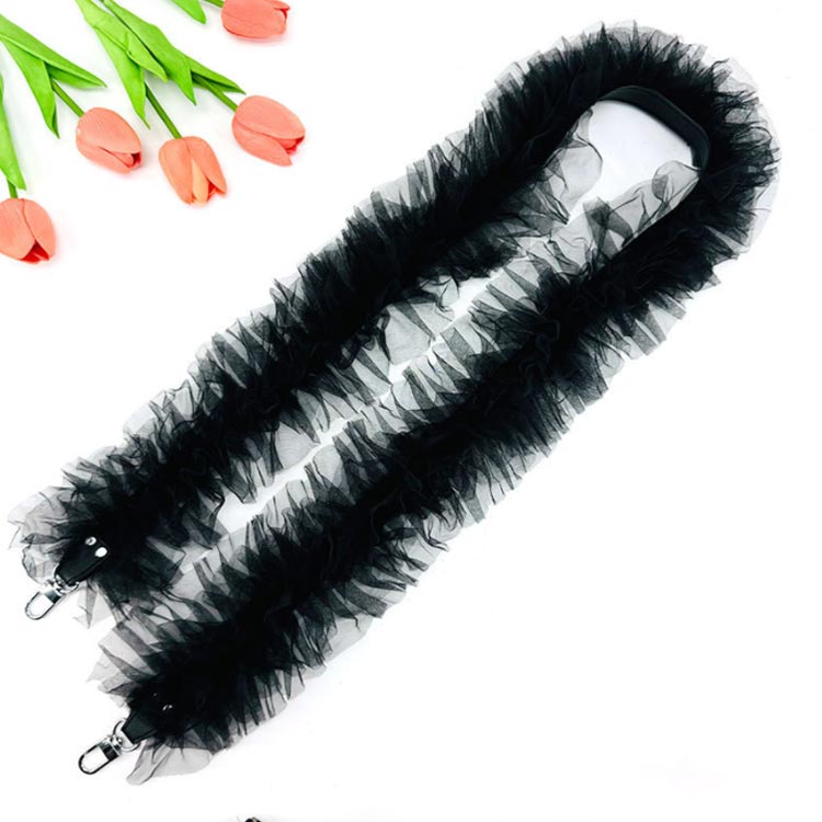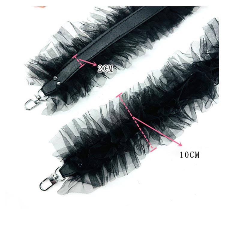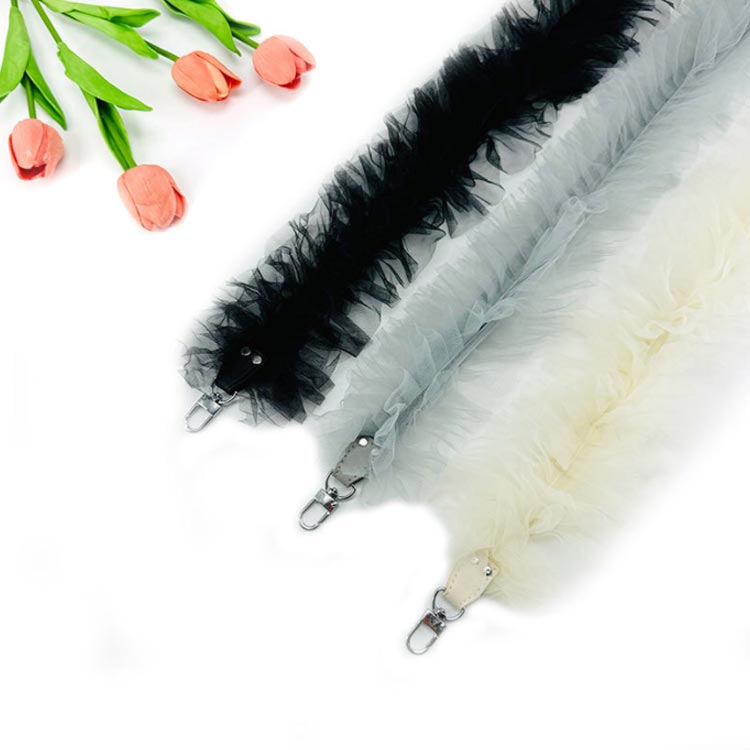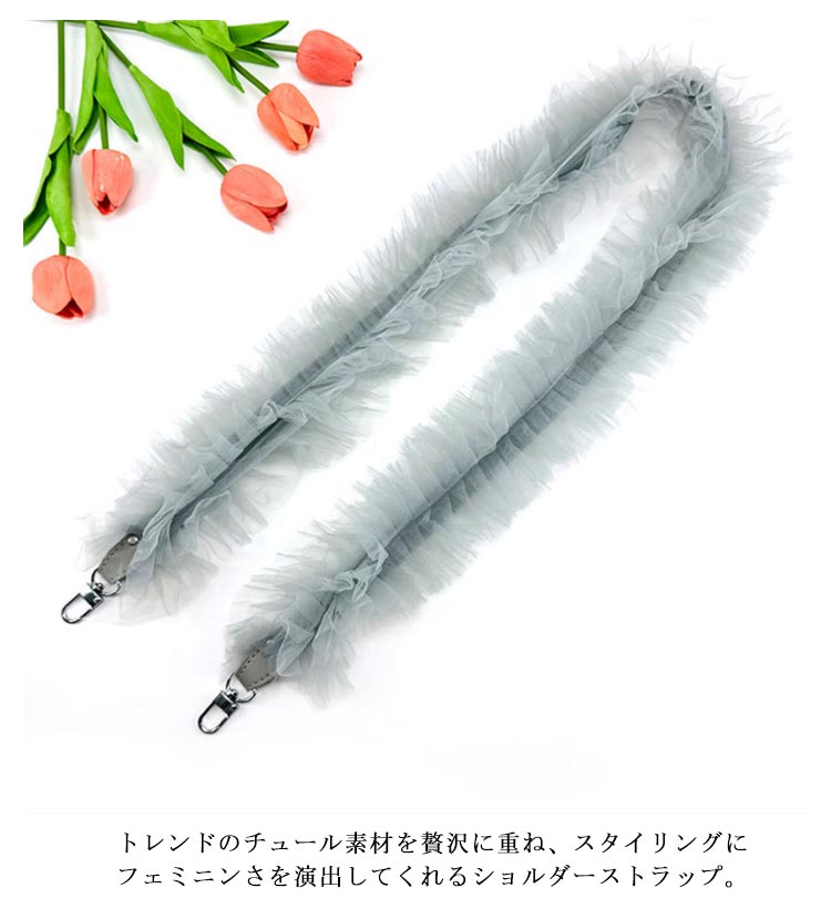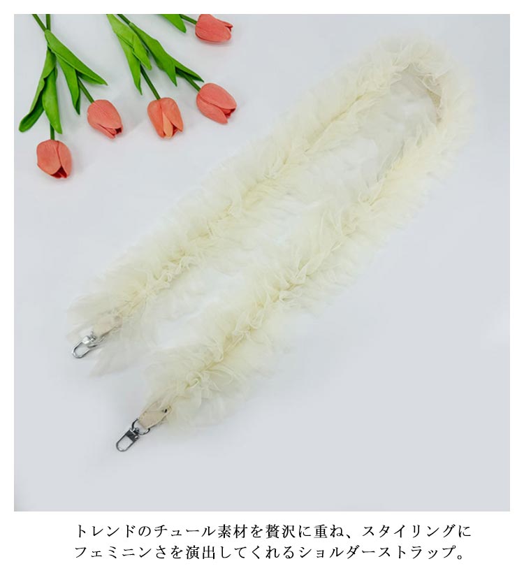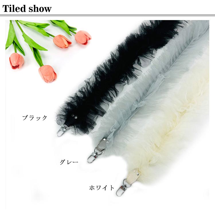 | 【チュールフリルストラップ】【3colors】【PU革素材】 トレンドのチュール素材を贅沢に重ね、スタイリングにフェミニンさを演出してくれるショルダーストラップ。 金具の繋ぎ部分はつけやすい仕様、PU(合成皮革)素材で作られており、高品質で耐久性があります。 お手持ちのスマホケースと組み合わせてスマホショルダーとしても素敵です。 スマホ、ミニバッグ、ハンディファンなどとのコーディネートにぴったり。 トレンドのたっぷりギャザーがカワイイコーデの主役級に映える | |