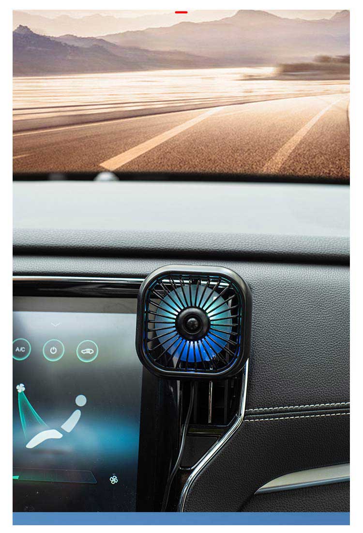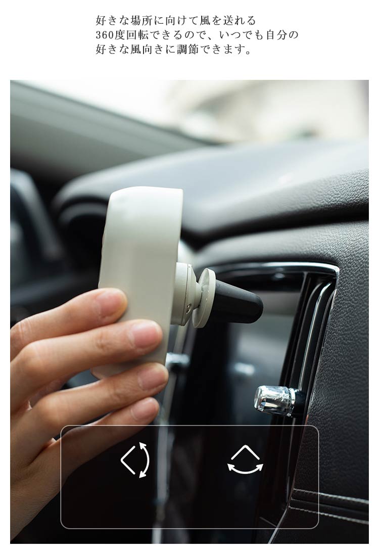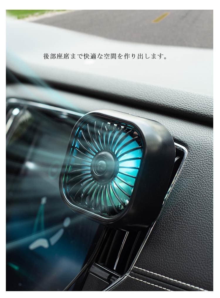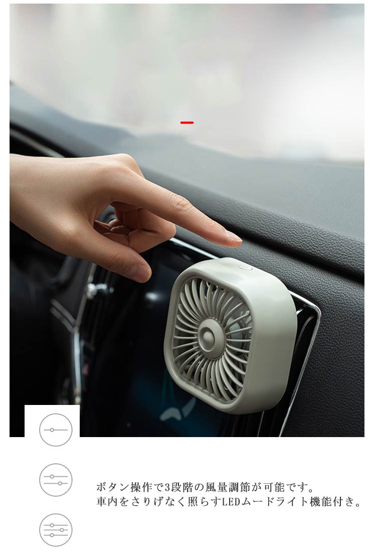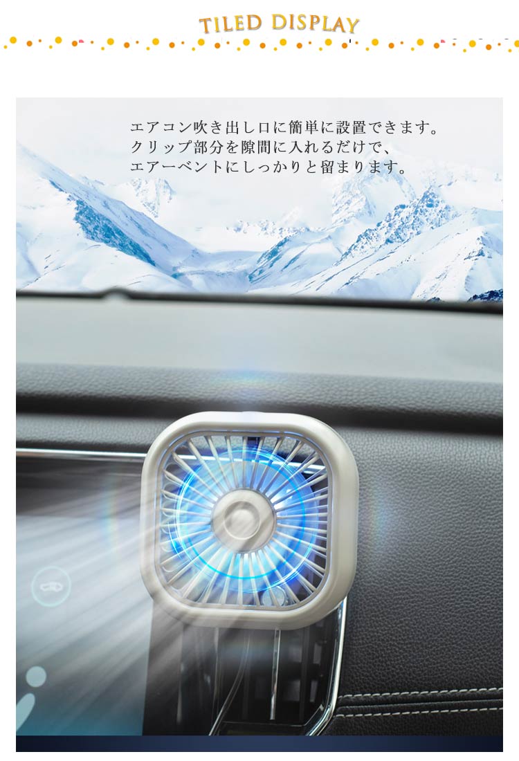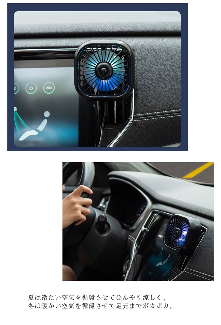 車のエアコンの吹き出し口に差し込むだけで冷暖房効率を上げる車載用扇風機です。エアコン吹き出し口に簡単に設置できます。クリップ部分を隙間に入れるだけで、エアーベントにしっかりと留まります。好きな場所に向けて風を送れる360度回転できるので、いつでも自分の好きな風向きに調節できます。ボタン操作で3段階の風量調節が可能です。車内をさりげなく照らすLEDムードライト機能付き。夏は冷たい空気を循環させてひんやり涼しく、冬は暖かい空気を循環させて足元までポカポカ。後部座席まで快適な空間を作り出します。USB電源なので車内だけでなく部屋やオフィスで卓上タイプとして使うことも可能です。