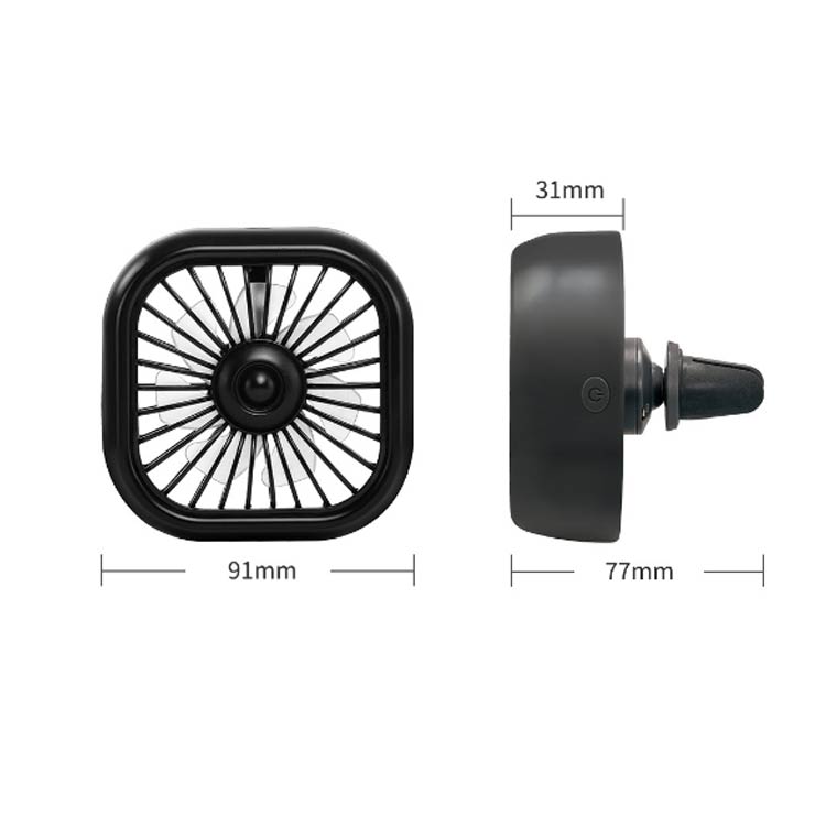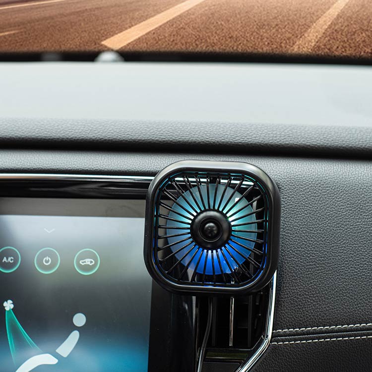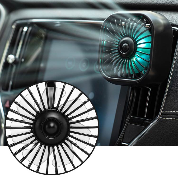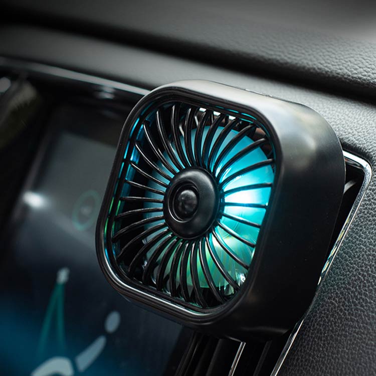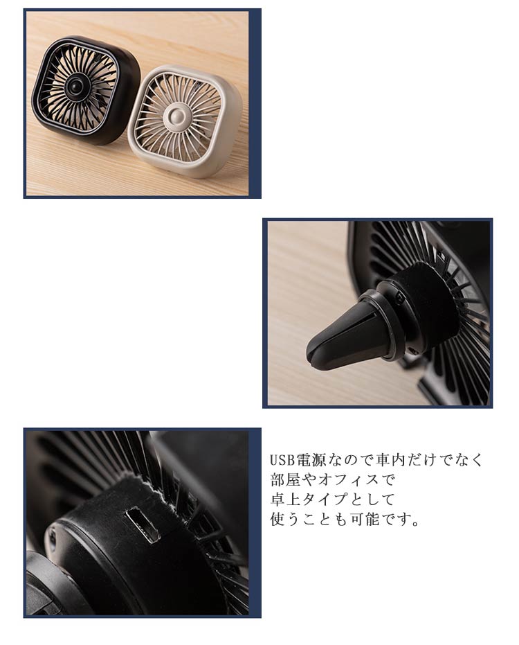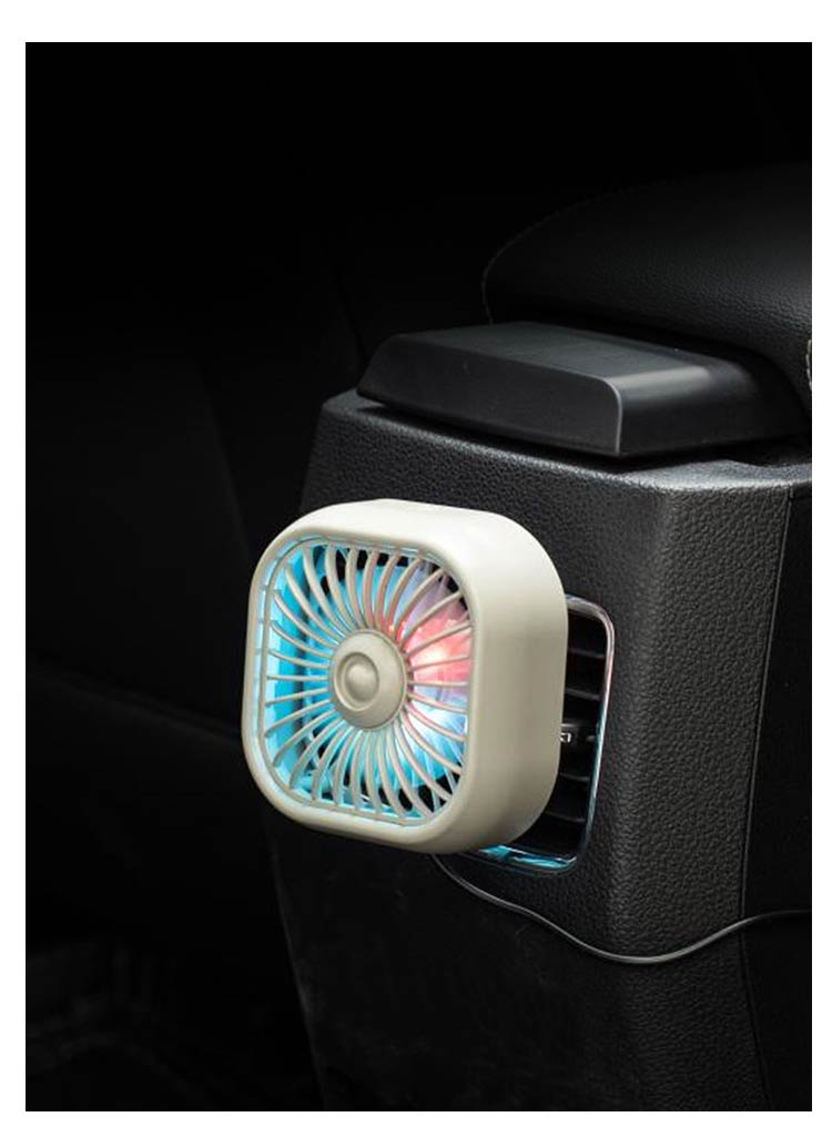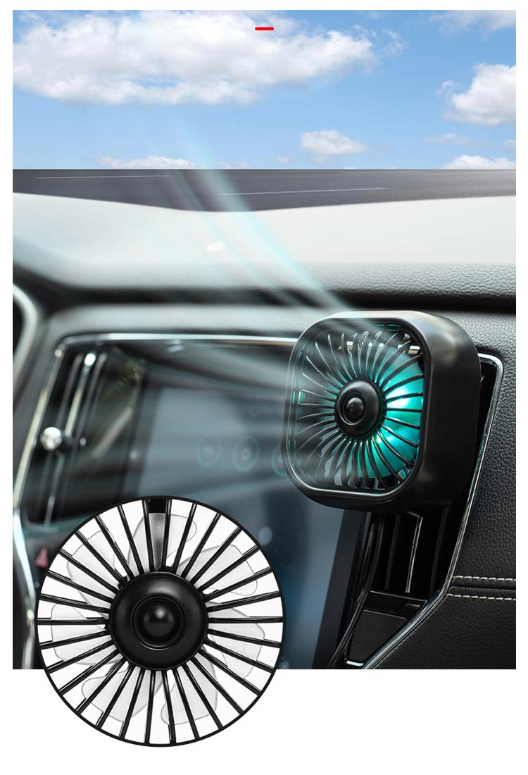 車のエアコンの吹き出し口に差し込むだけで冷暖房効率を上げる車載用扇風機です。エアコン吹き出し口に簡単に設置できます。クリップ部分を隙間に入れるだけで、エアーベントにしっかりと留まります。好きな場所に向けて風を送れる360度回転できるので、いつでも自分の好きな風向きに調節できます。ボタン操作で3段階の風量調節が可能です。車内をさりげなく照らすLEDムードライト機能付き。夏は冷たい空気を循環させてひんやり涼しく、冬は暖かい空気を循環させて足元までポカポカ。後部座席まで快適な空間を作り出します。USB電源なので車内だけでなく部屋やオフィスで卓上タイプとして使うことも可能です。