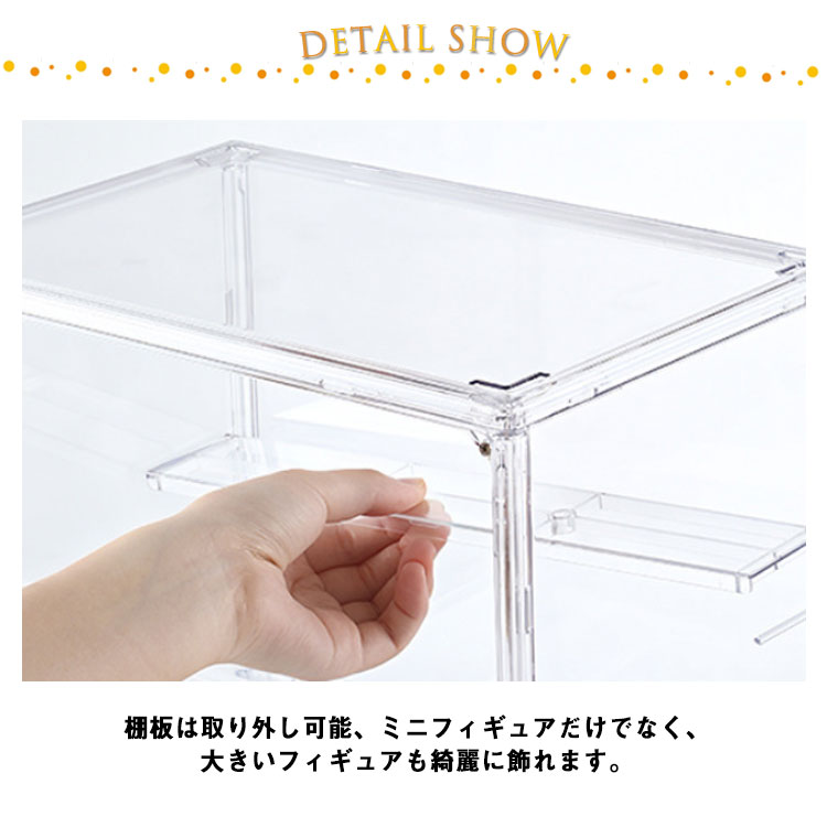 | フィギュアやプラモデル、ミニカーや人形、ガシャポンなど大切なコレクションを見栄えするとともに、埃からしっかり守るコレクションケース。 透明度高いアクリル素材で、コレクションをより美しく魅せる。 棚板は取り外し可能、ミニフィギュアだけでなく、大きいフィギュアも綺麗に飾れます。 開け閉め簡単のマグネット付き扉、強力な気密性と防塵性を備えています。 段差付き、一つ一つよく見え、飾れる幅が増えるのにコンパクトにまとまります。 | |