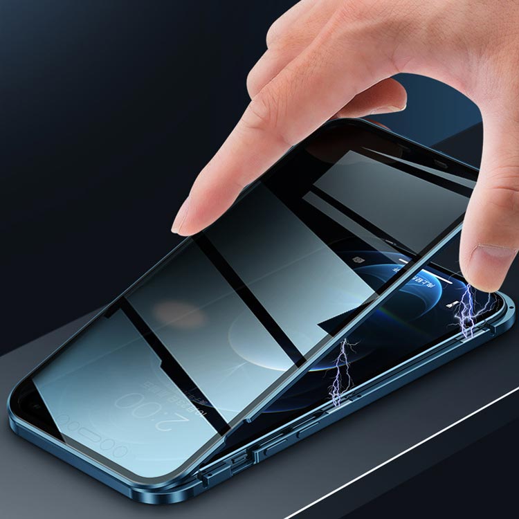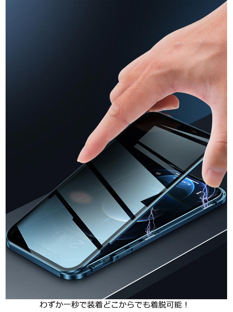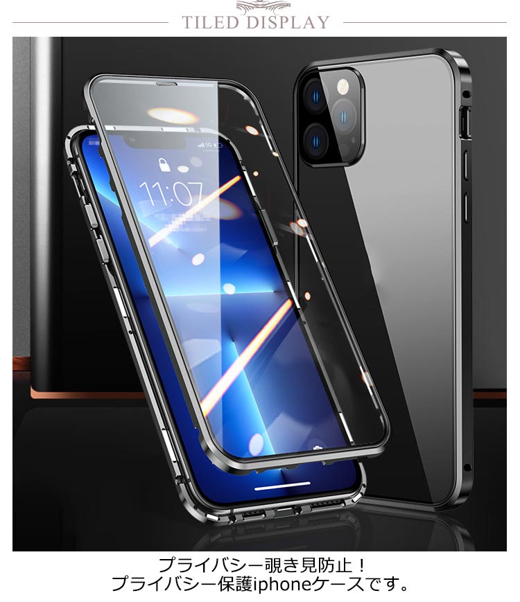 硬度9Hの強化ガラス!前後ガラスケースプライバシー覗き見防止!プライバシー保護iphoneケースです。透明な背面はガラスのプレートを使用し、iPhoneの自然な外観を維持するデザインになっています。指紋を防ぐ、硬度9Hの強化ガラスで画面を全面保護!わずか一秒で装着どこからでも着脱可能!落下防止、耐衝撃・傷から守る。iphone ケースは高品質のアルミニウム合金製フレームを使用、カバーを軽量化・しっかり保護。