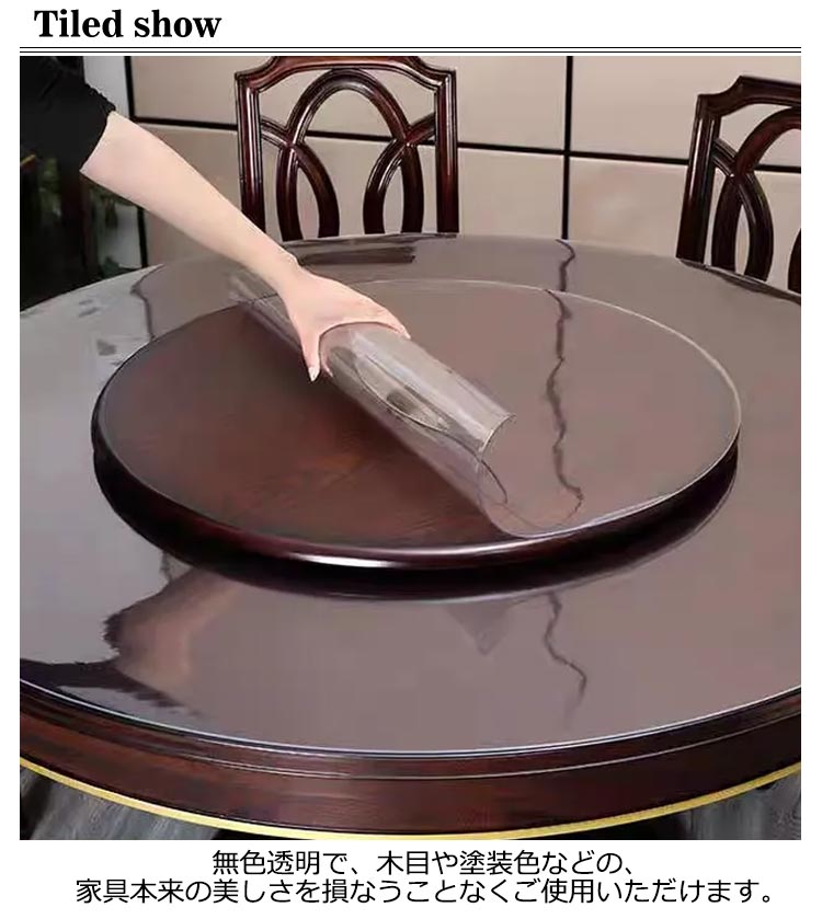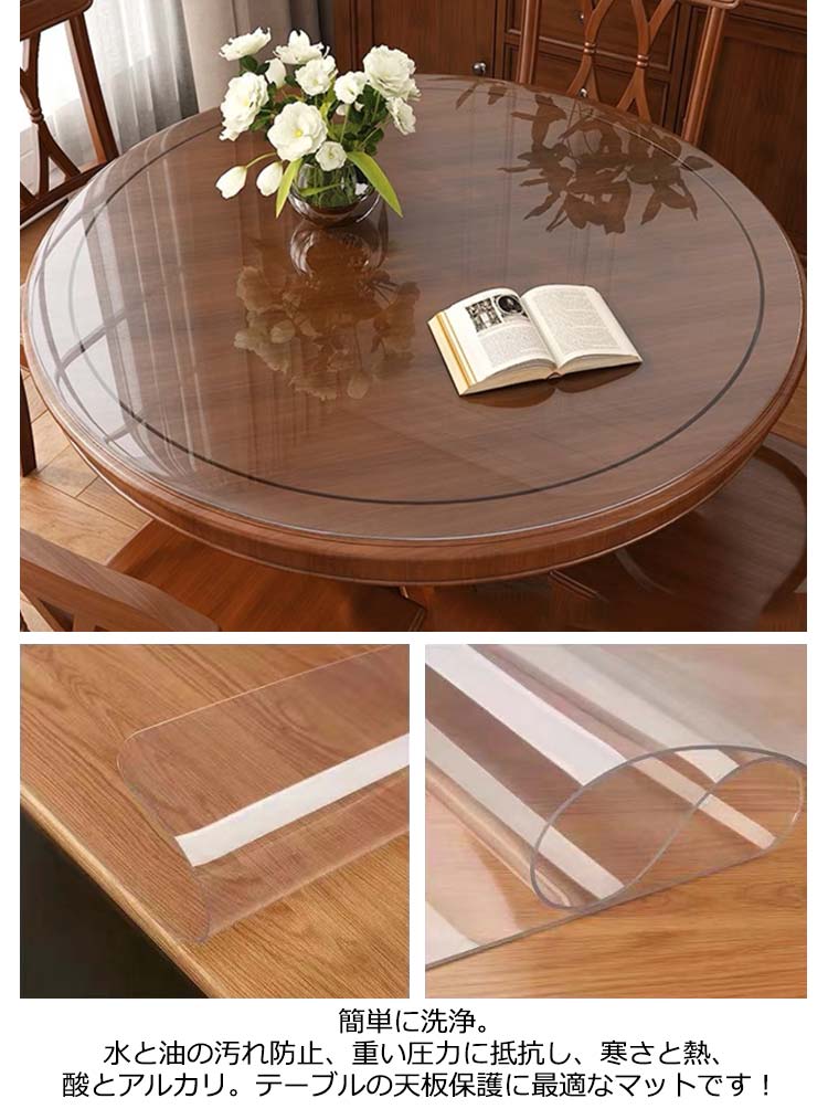 | 60CM 70CM 80CM 90CM 100CM 110CM 120CM PVCテーブルクロス、シンプルで明るいお部屋を彩ります! 無色透明で、木目や塗装色などの、家具本来の美しさを損なうことなくご使用いただけます。 耐久性に優れていて、 ホテル、レストランにおけるハードユースにも安心して使用される! 簡単に洗浄。 水と油の汚れ防止、重い圧力に抵抗し、寒さと熱、酸とアルカリ。テーブルの天板保護に最適なマットです! | |