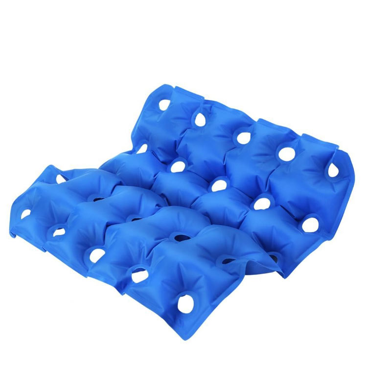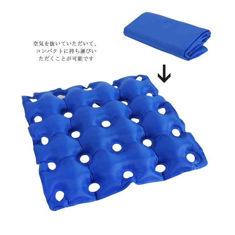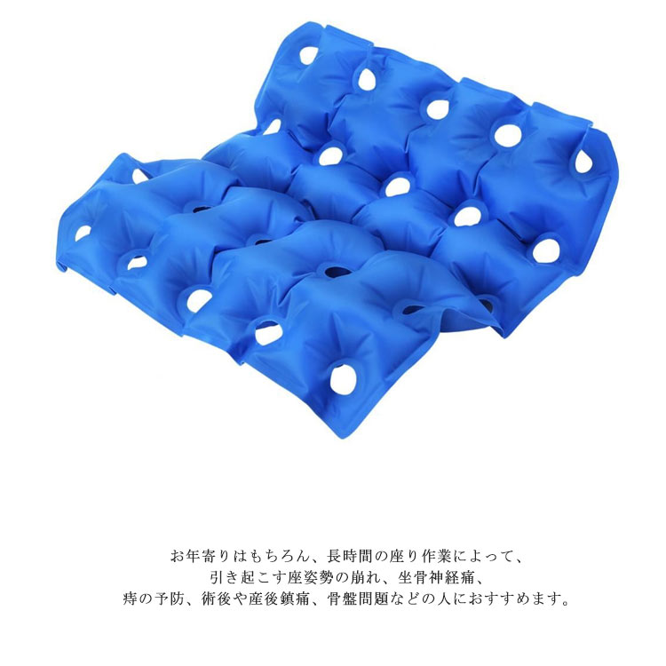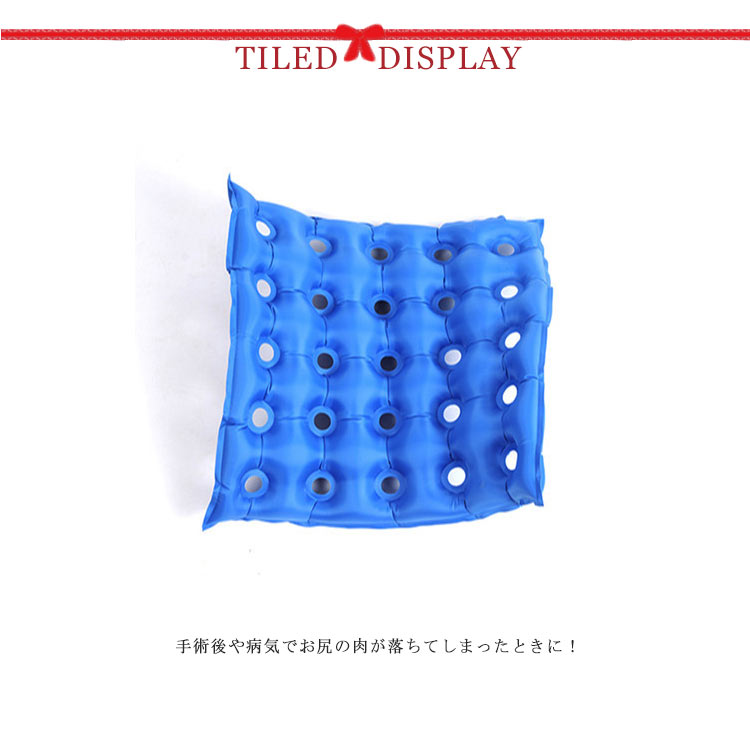 手術後や病気でお尻の肉が落ちてしまったときに!長時間座っているとお尻が痛くなってしまう方にお尻が痛くなりにくいエアークッションです。25個の小さめの通気孔があるので、ムレにくく、うっ血や肌の密着をやわらげてお尻がとても楽になります。車椅子をご利用の際にお尻が痛くてたいへんなときでも適度なクッション性で痛みをやわらげてくれます。座布団くらいの大きさなので、床ずれ防止用に身体に当てていただくのも効果的です。お年寄りはもちろん、長時間の座り作業によって、引き起こす座姿勢の崩れ、坐骨、痔の予防、術後や産後鎮痛、骨盤問題などの人におすすめます。付属のエアポンプを使って、空気はパンパンに入れずに少し少なめにしていただくほうが快適にご利用いただけます。空気を抜いていただいて、コンパクトに持ち運びいただくことが可能です。