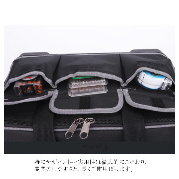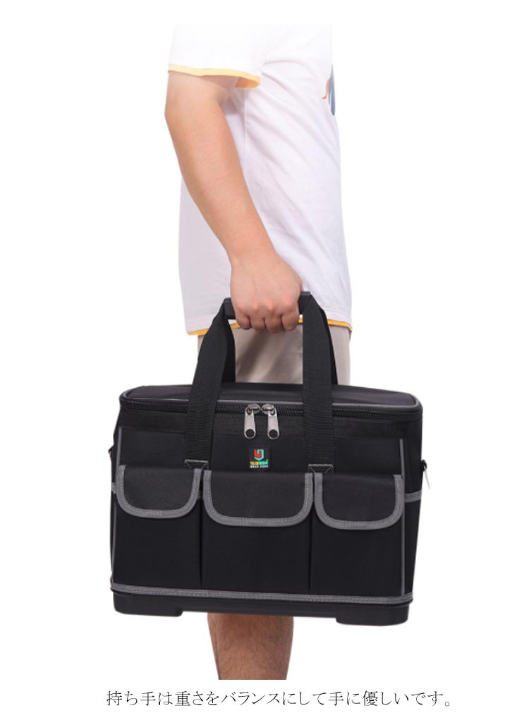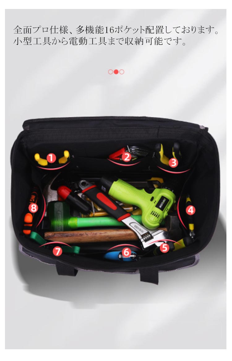 【大容量】全面プロ仕様、多機能16ポケット配置しております。小型工具から電動工具まで収納可能です。【耐摩耗抜群】600D高密度オックスフォードを採用しています。強化縫製でしっかりと仕上げられ、耐荷重、耐摩擦、耐久性に優れてます。【足置き台付き 】 ツールバッグを支える役割だけでなく、地面と2センチの隙間を作るので、劣悪な工場現場との直接接触を避けることも出来ます。【多用途】工具入れベルトは様々な道具や工具の収納、携帯に、仕切りがついており大変便利です。ガーデニング、釣り、工芸、建築、大工、請負業者、屋根、ラインマン、石工、鉄工などの作業を携わる人に最適にします。日常生活のDIY活動だけでなく、自動車修理、木工および専門な修理活動も最適です。【強化持ち手】持ち手は重さをバランスにして手に優しいです。【 ファスナー】特にデザイン性と実用性は徹底的にこだわり、開閉のしやすさと、長くご使用頂けます。