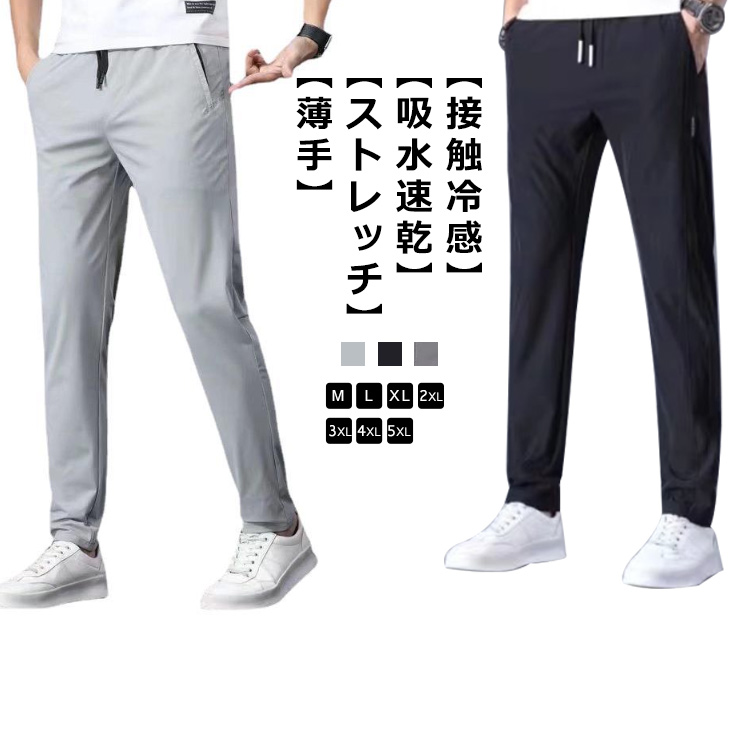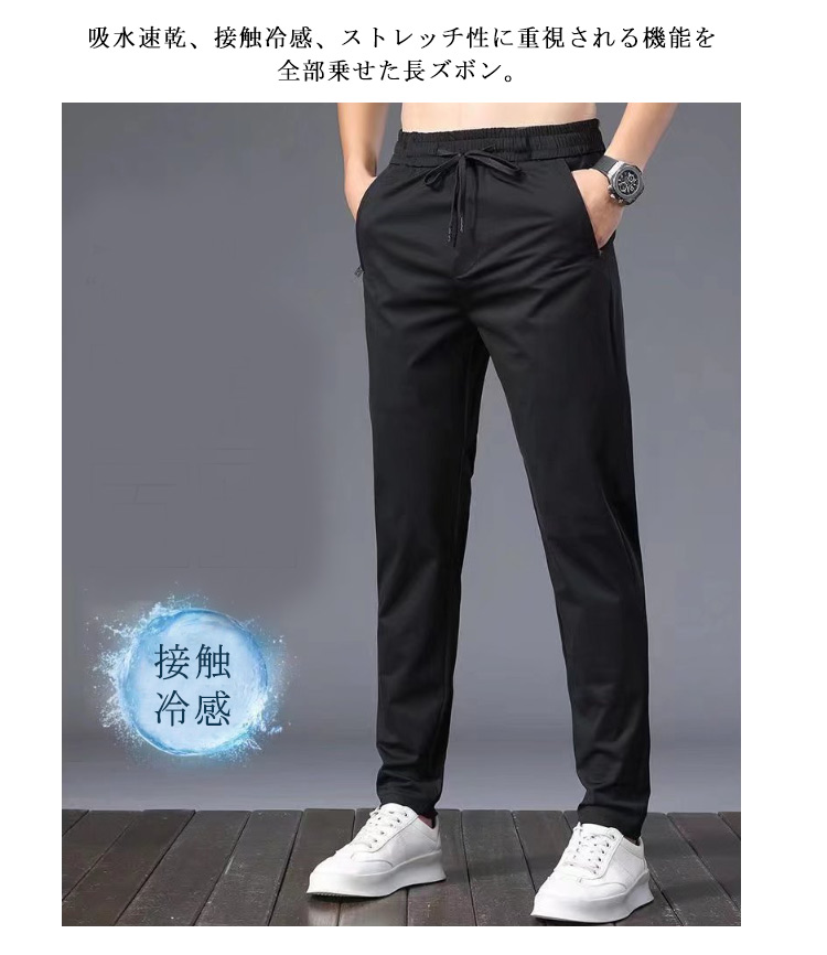 【接触冷感】【吸水速乾】【ストレッチ】【薄手】吸水速乾、接触冷感、ストレッチ性に重視される機能を全部乗せた長ズボン。冷感生地を採用して、肌と接触した瞬間に温度を下げるクール感があり、夏の蒸れに対応する。通気性が良い生地を採用しさらっとした着心地。リラックスウエアの着軽さと、スポーツウエアの動きやすさの両方を併せ持ちストレスのない穿き心地です。ウエスト部分はゴムと紐仕様なのでサイズ調節もラクラク。普段着はもちろん、スポーツ、アウトドア、フェス、通勤、通学、ランニング・ゴルフなど、あらゆるシーンで使える万能itemです。