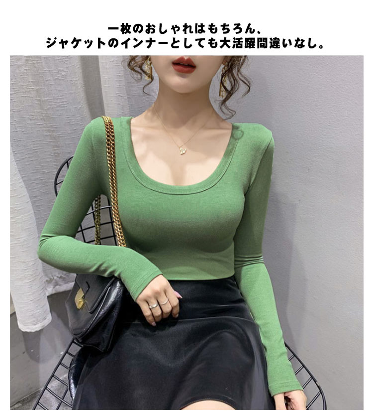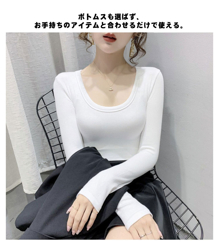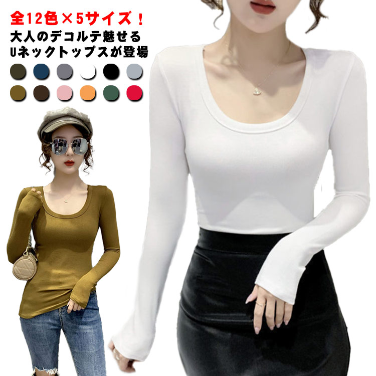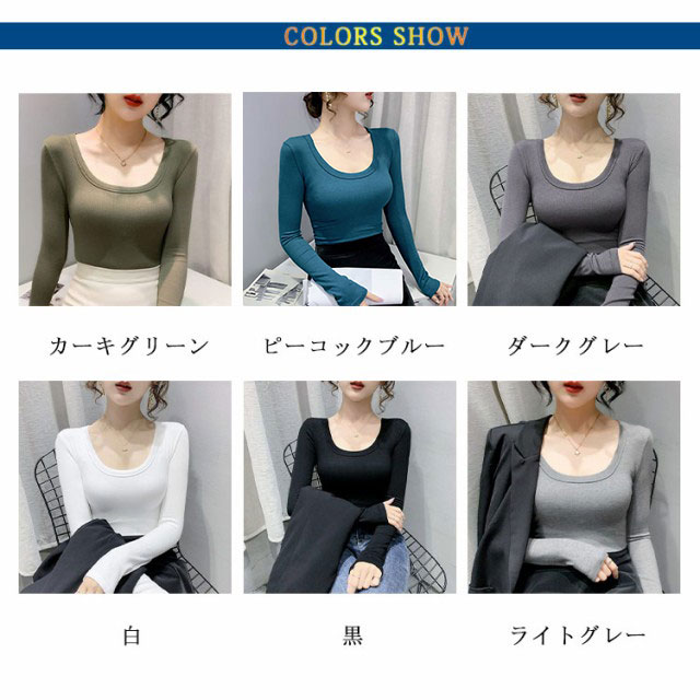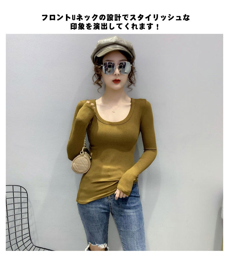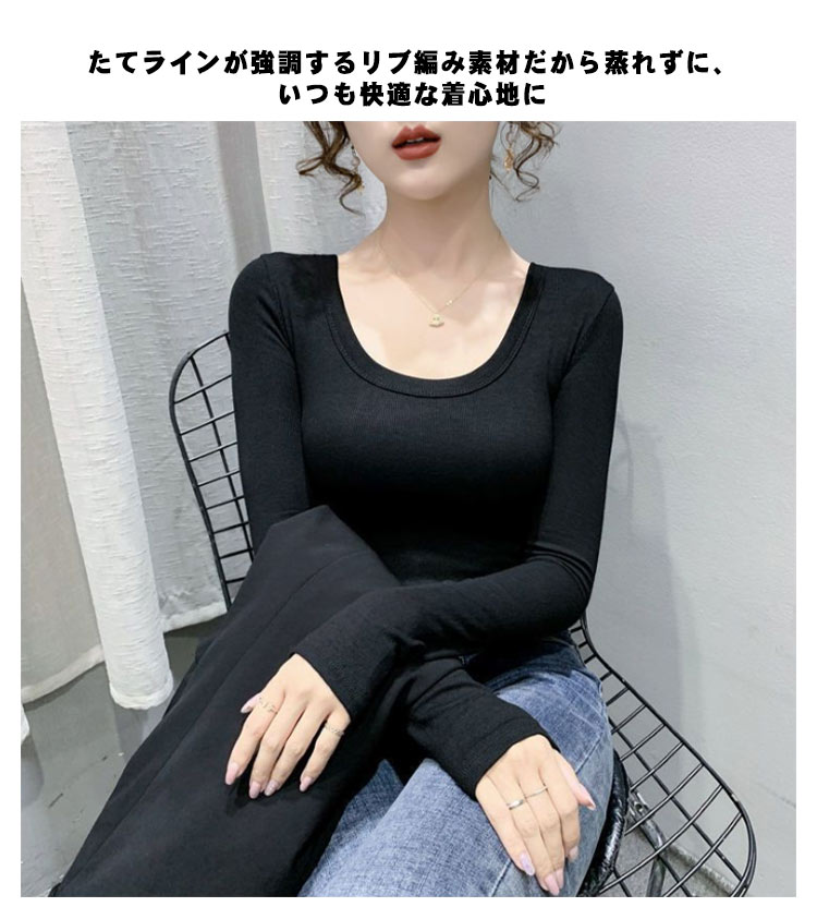 全12色×5サイズ! リブ tシャツ 長袖 Uネック リブトップス インナー トップス 長袖tシャツ クルーネック タイト トップス リブニット ニット リブ 韓国風 レディース 無地 春服 秋服 春秋 送料無料