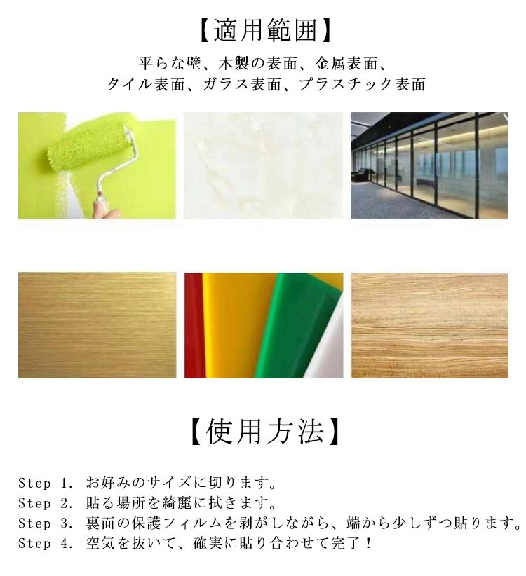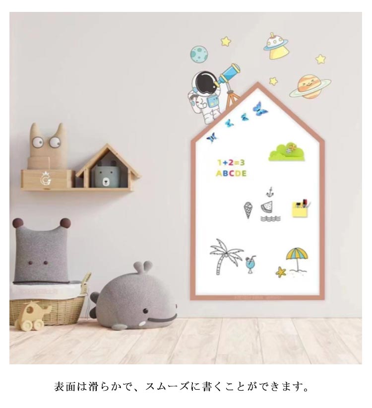 45×100cm 60×90cm4色磁石がくっつくホワイトボード標準のシートより粘着力をアップし、壁にしっかりと吸着でき、貼り直しも可能で、取り付けやすく、壁を有効に活用します表面は滑らかで、スムーズに書くことができます。活用場所いろいろ!子供部屋、学校、学習塾、オフィス、会議室、イベント会場など!繰り返し利用可能で、子供の想像力を満足でき、お絵かき・落書き・勉強に色々発散できます。オフィス用掲示板・DIY・毎日更新にも幅広い場面で大活躍です。家では伝言メモ、スケジュール表、メニューボード・デコレーションとして使え、いろいろと活用できます。【適用範囲】平らな壁、木製の表面、金属表面、タイル表面、ガラス表面、プラスチック表面【使用方法】Step 1. お好みのサイズに切ります。Step 2. 貼る場所を綺麗に拭きます。Step 3. 裏面の保護フィルムを剥がしながら、端から少しずつ貼ります。Step 4. 空気を抜いて、確実に貼り合わせて完了!