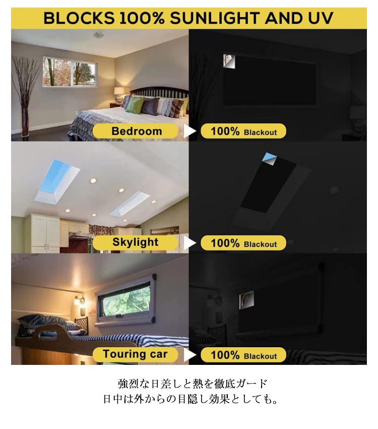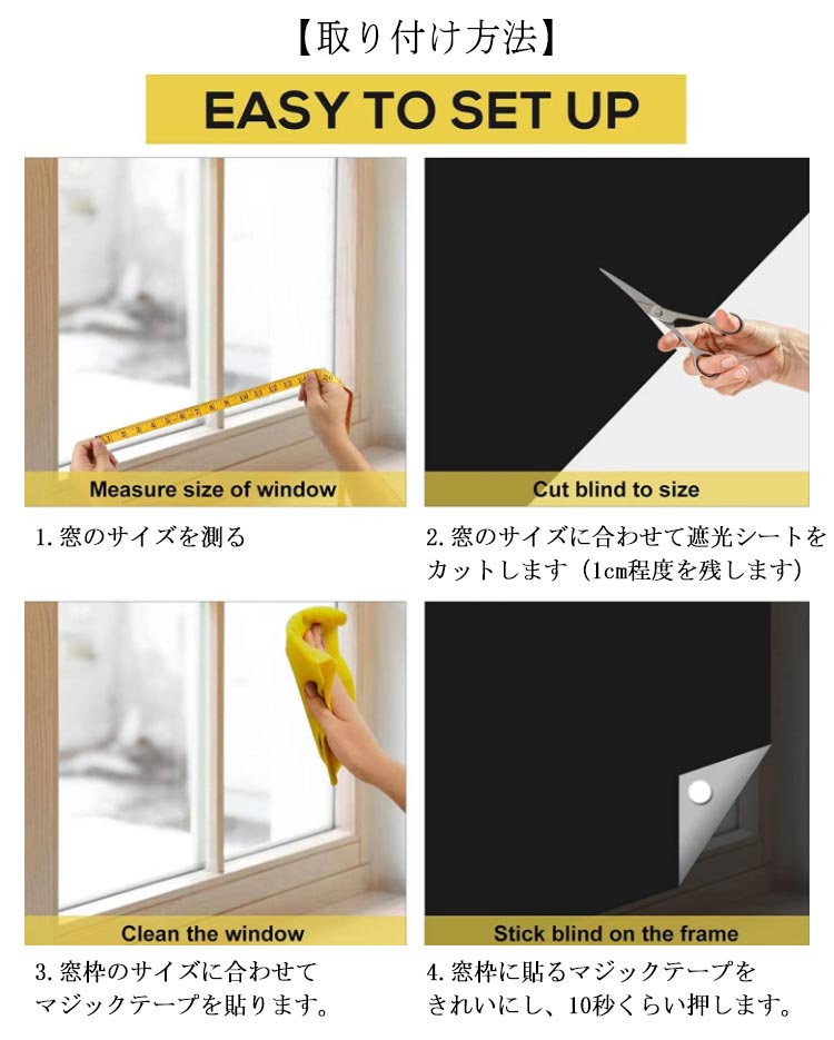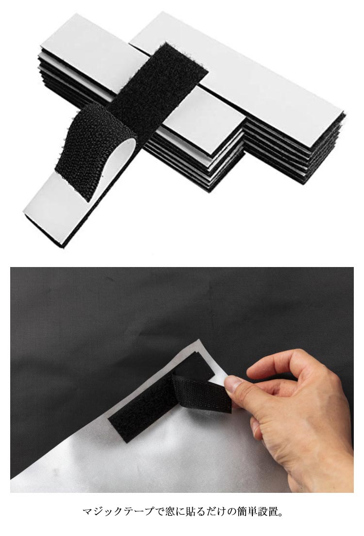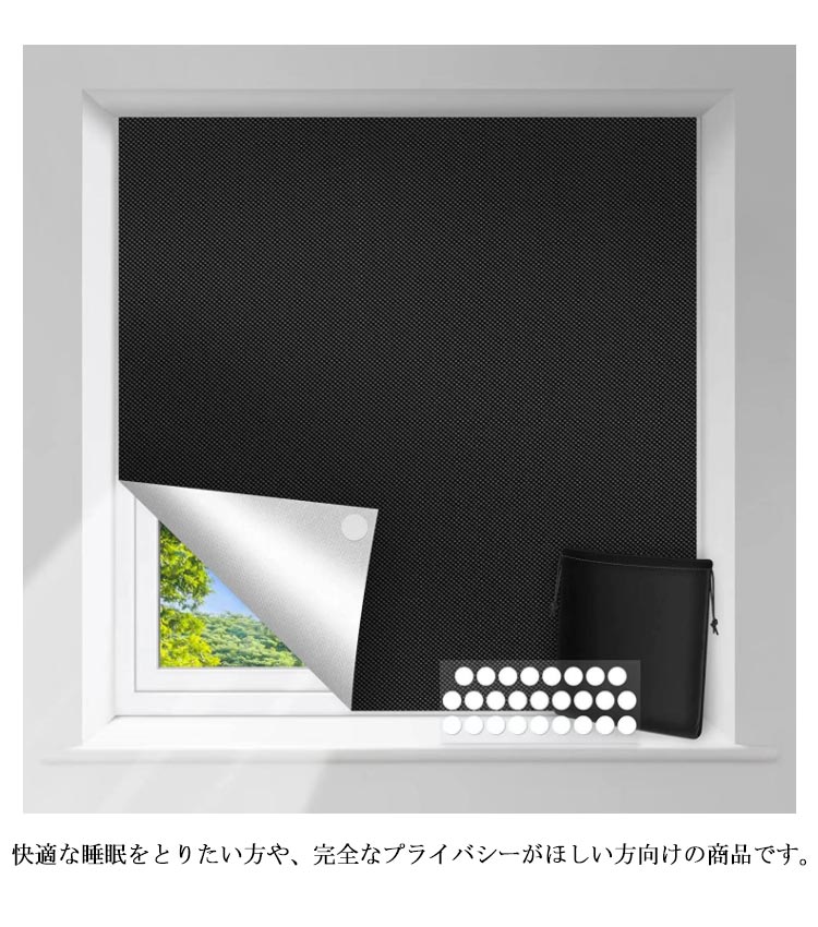 ・少しの光も通さずしっかり遮光!・快適な睡眠をとりたい方や、完全なプライバシーがほしい方向けの商品です。・マジックテープで窓に貼るだけの簡単設置。・使用シーンに応じて好みのサイズにカットできます。・強烈な日差しと熱を徹底ガード・シルバーコーティング加工が施されているので紫外線から守ってくれます。・日中は外からの目隠し効果としても。・遮光、遮熱効果で冷房効率がアップします。・【こんなお部屋におすすめ】朝日や西日がよくあたるお部屋、寝室・【こんな方におすすめ】光を遮り朝までぐっすり眠りたい方、1級遮光カーテンへの買い替えをお悩みの方【取り付け方法】1.窓のサイズを測る2.窓のサイズに合わせて遮光シートをカットします(1cm程度を残します)3.窓枠のサイズに合わせてマジックテープを貼ります。4.窓枠に貼るマジックテープをきれいにし、10秒くらい押します。